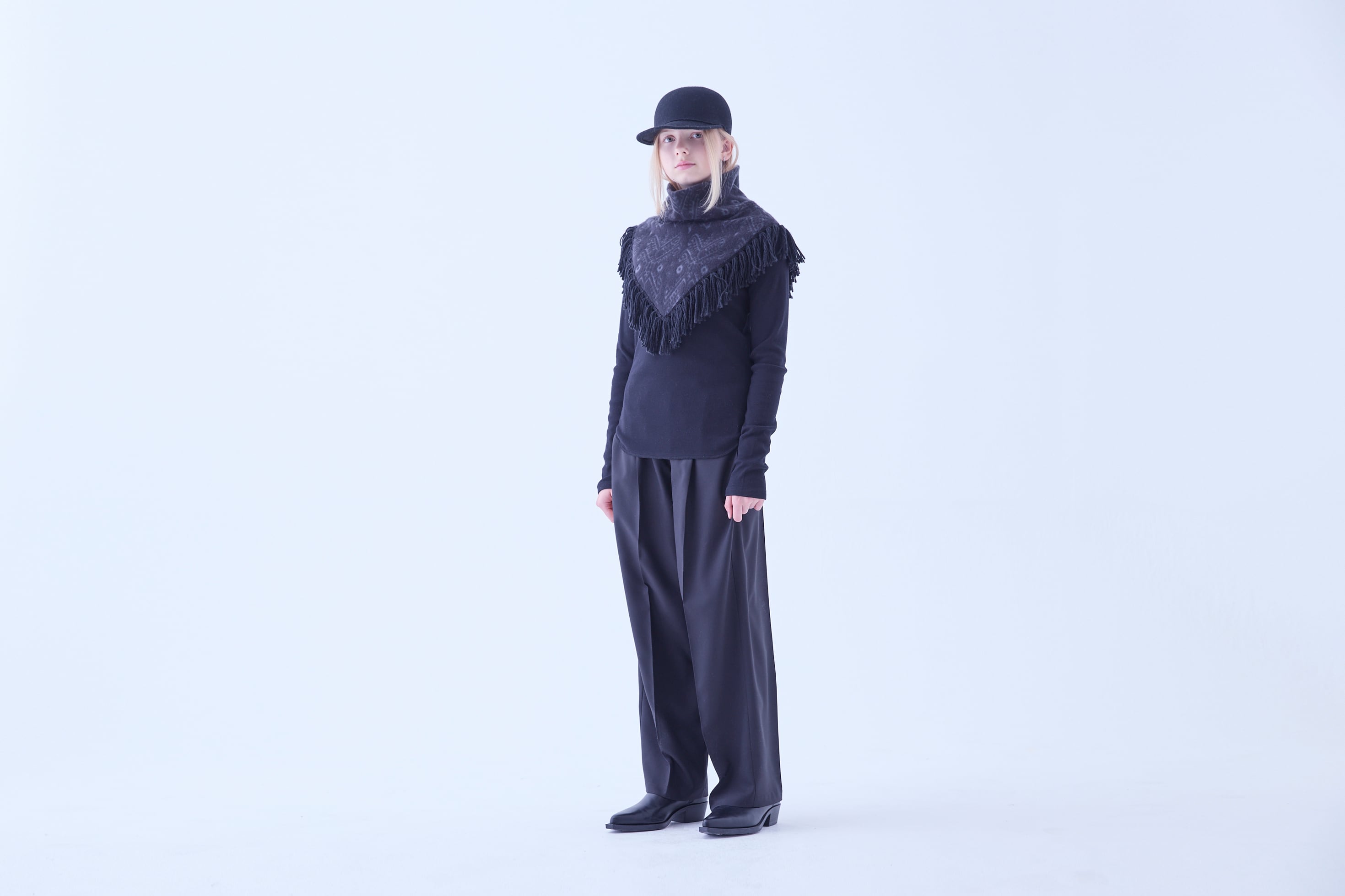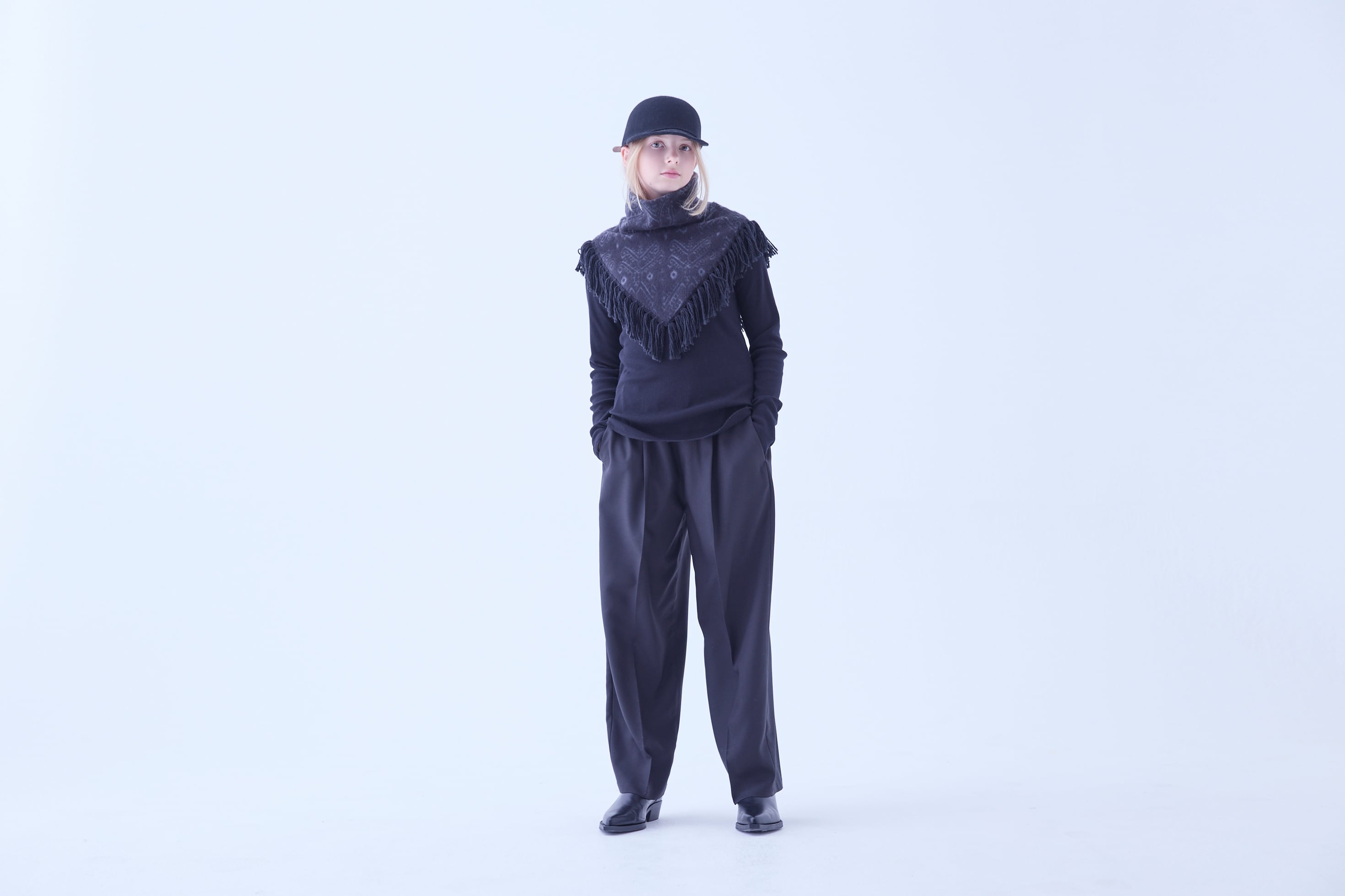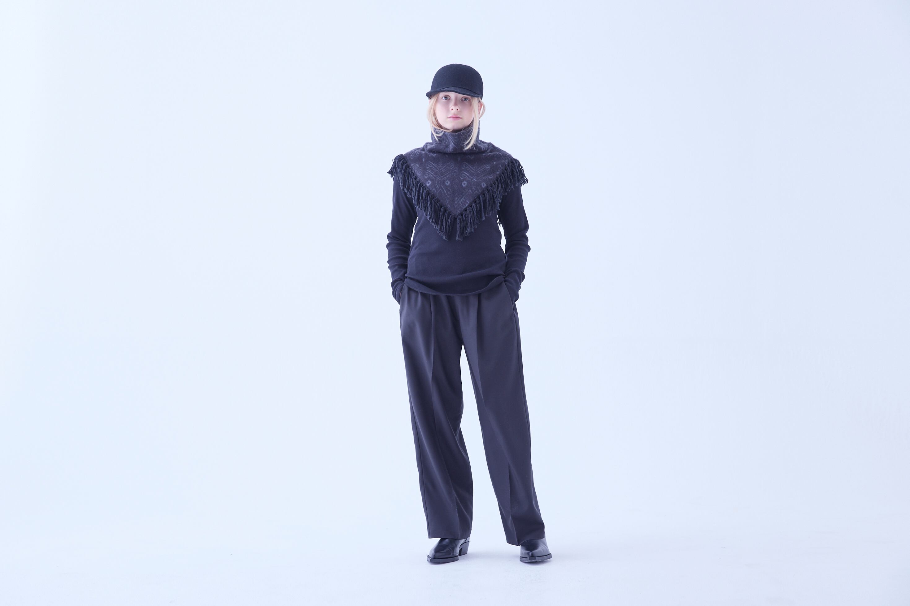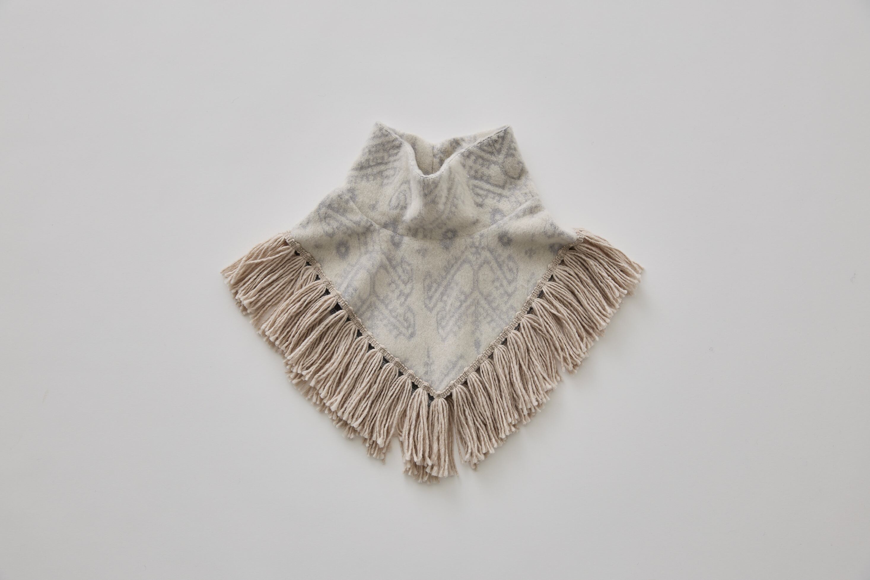ハイネックのケープはシルエットにぐるりと1周ウールフリンジをあしらっています。Sサイズはベビーからキッズ、Mサイズはキッズからウィメンズで兄弟姉妹、親子で共有していただけるアイテムです。