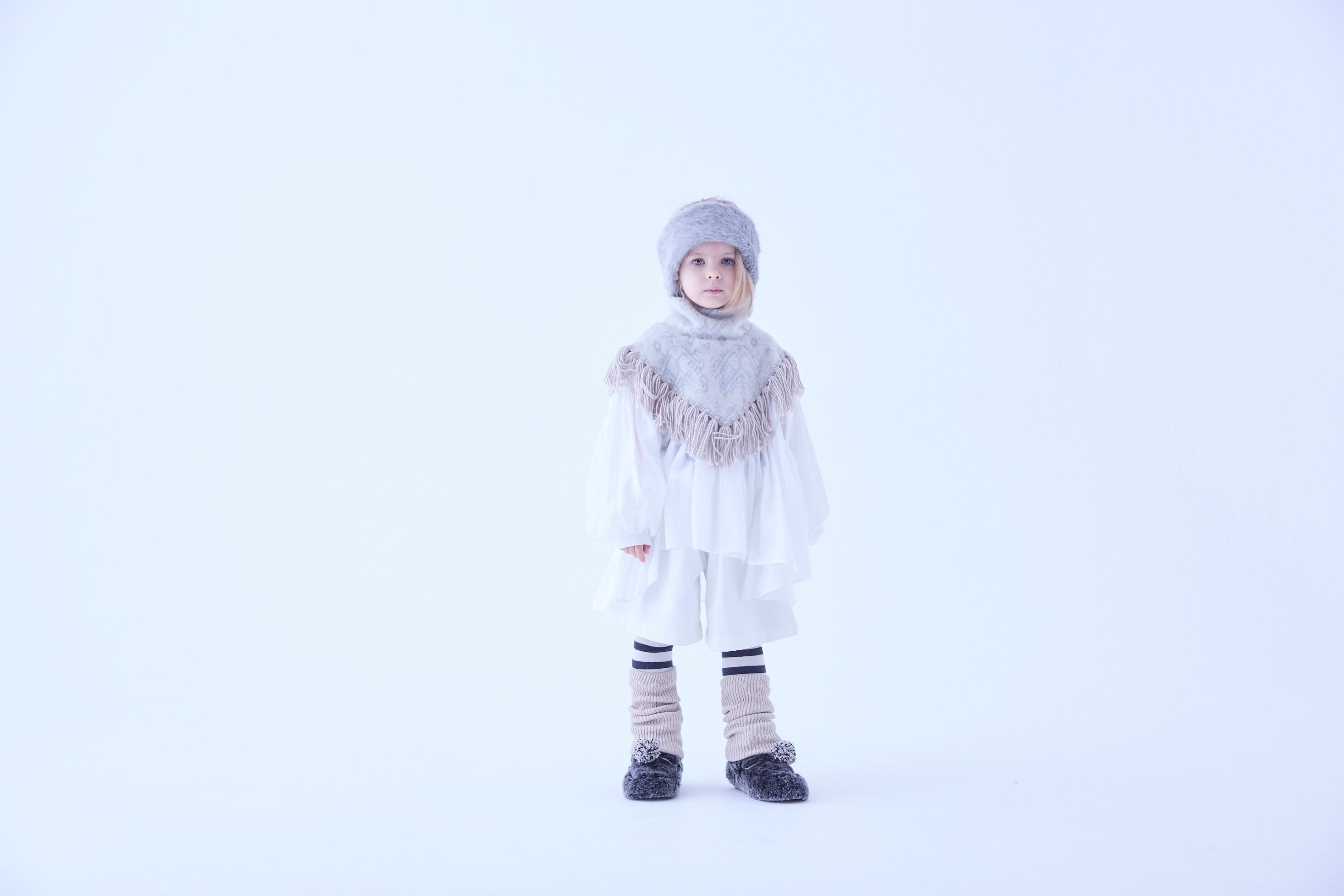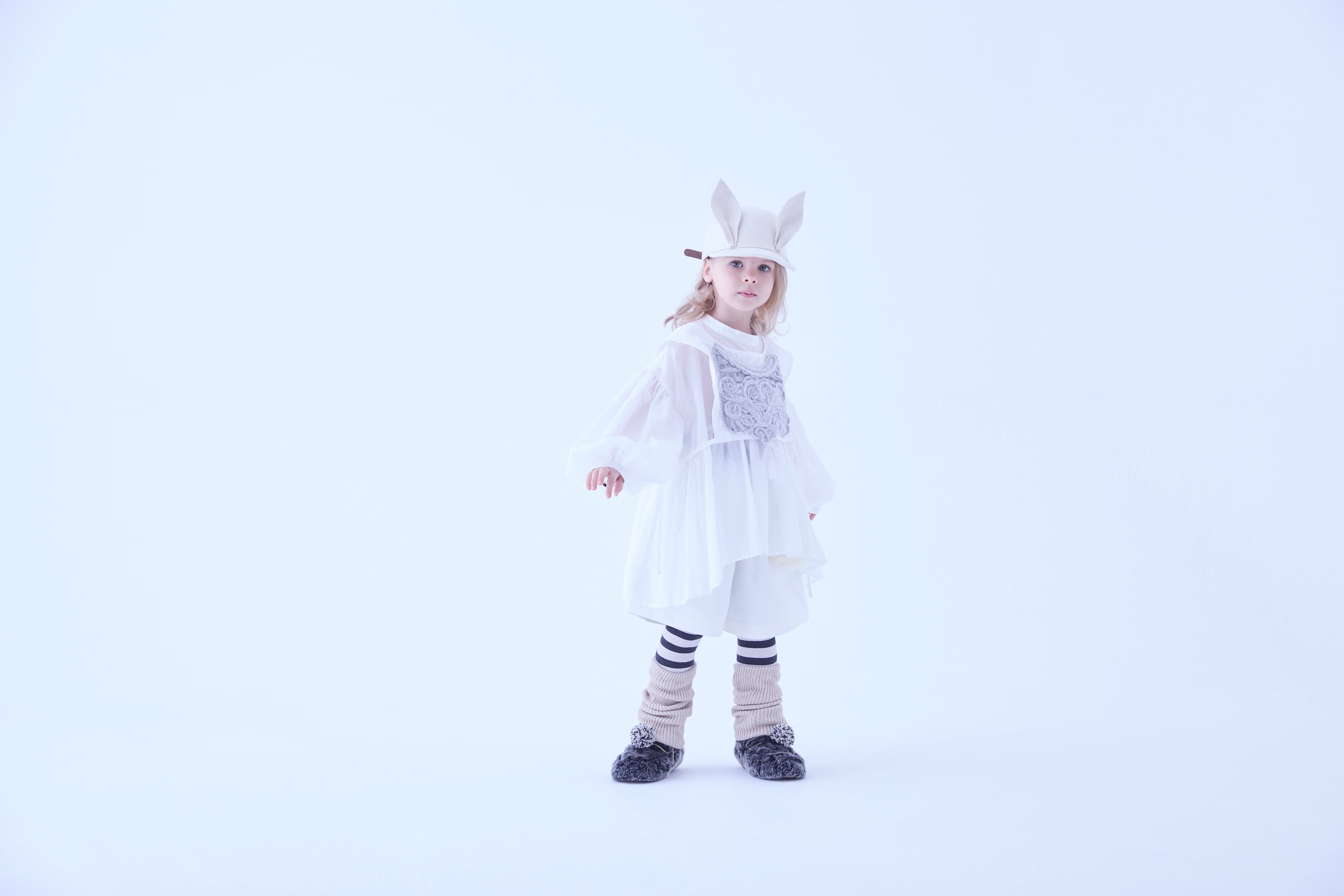王女の紋章をイメージしたニット刺繡のエンブレムを重ねた真っ白でギャザーたっぷりなブラウスや鎧のようなフリースベスト、雪の結晶柄を元にオリジナルジャガードにしたふわふわなテキスタイルのアイテム、新デザインのニットマントとビーニー、ウサギ耳のウールキャップなど、白をメインカラーにしたユキウサギのような冬のコーディネートが楽しめるコレクションです。