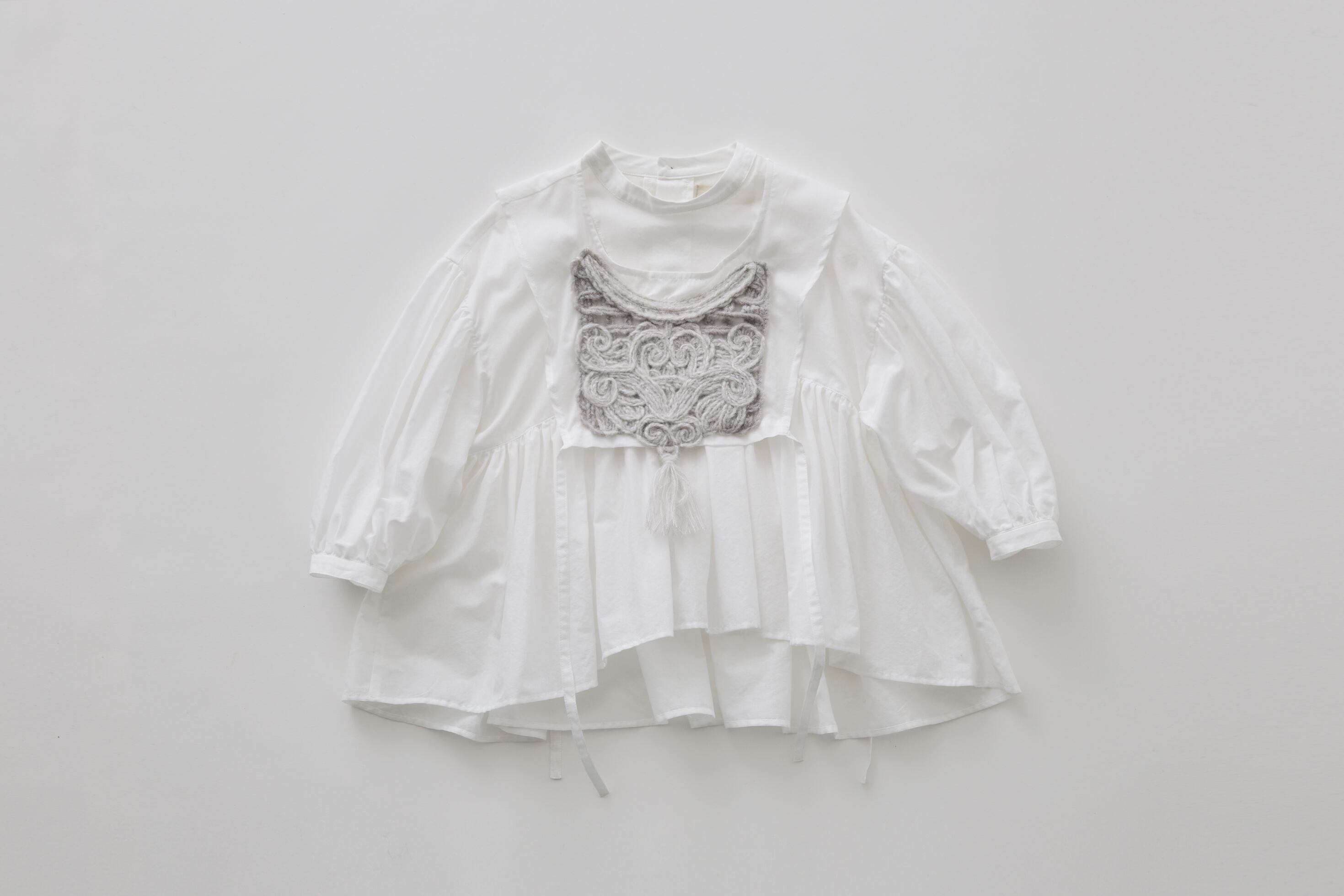 ユキウサギの王女の紋章をイメージした図案をモヘアのようなニット糸を三つ編みに編んでコード刺繍にしたパーツをフロントに付けたベストと、ウェストやお袖にギャザーたっぷりな極薄のコットンローンブラウスを重ねた今季のものがたりの王女のイメージにぴったりな1着。
