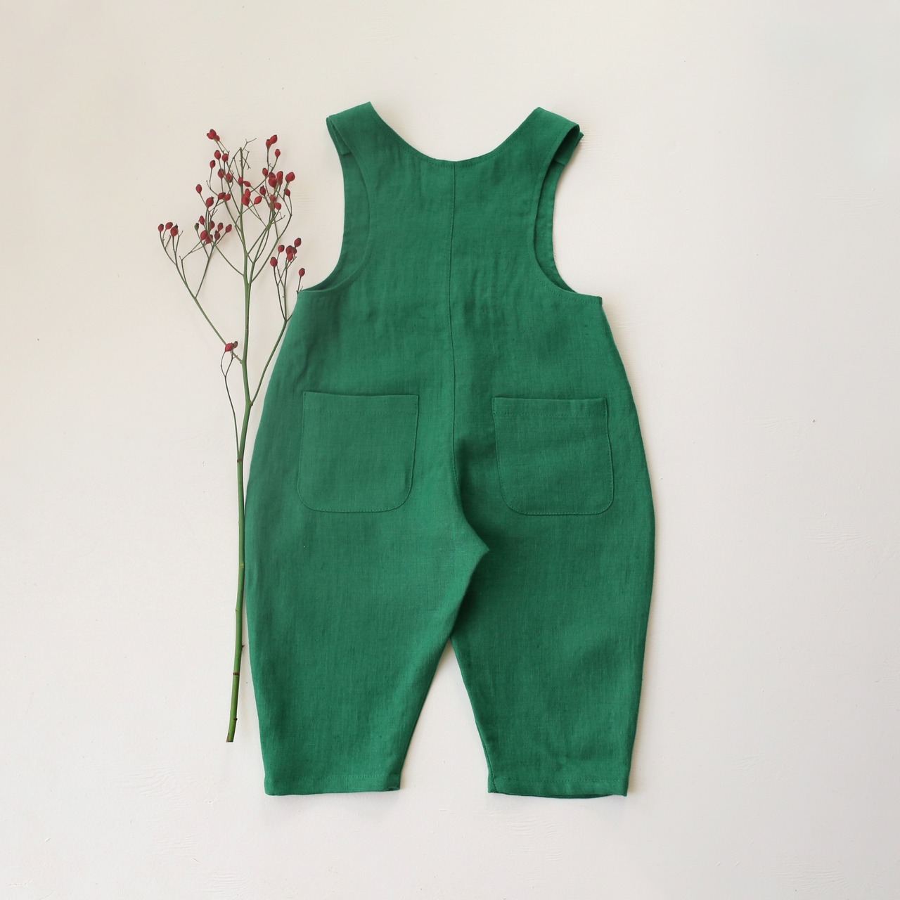 肩のボタンで着脱できる、ゆったりシルエットのオーバーオール。