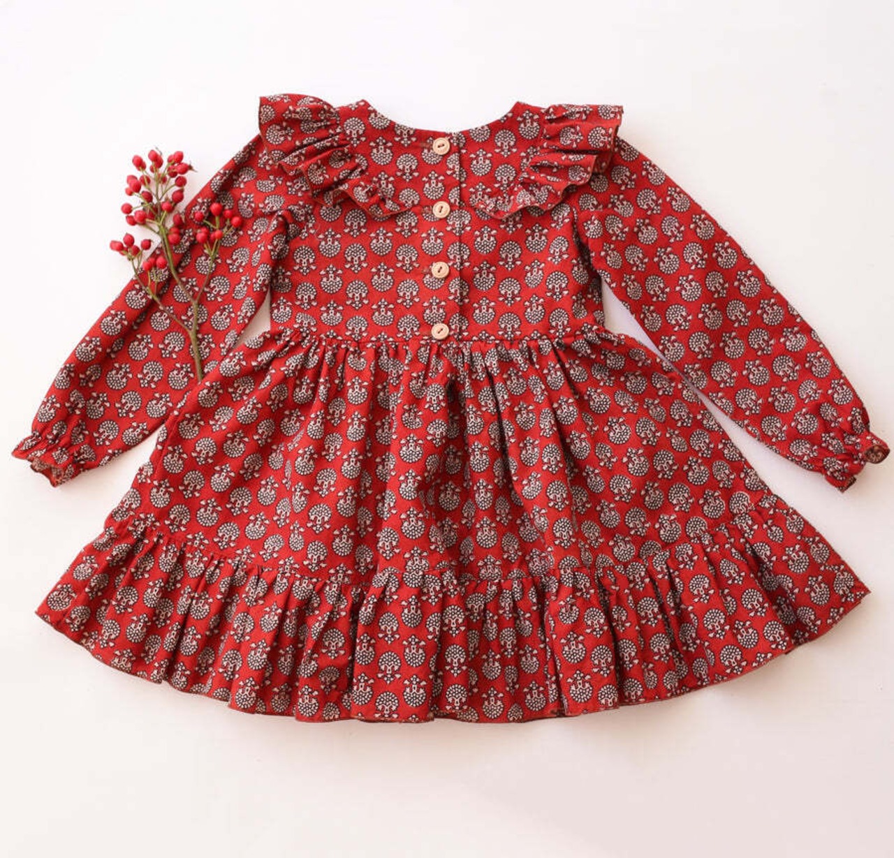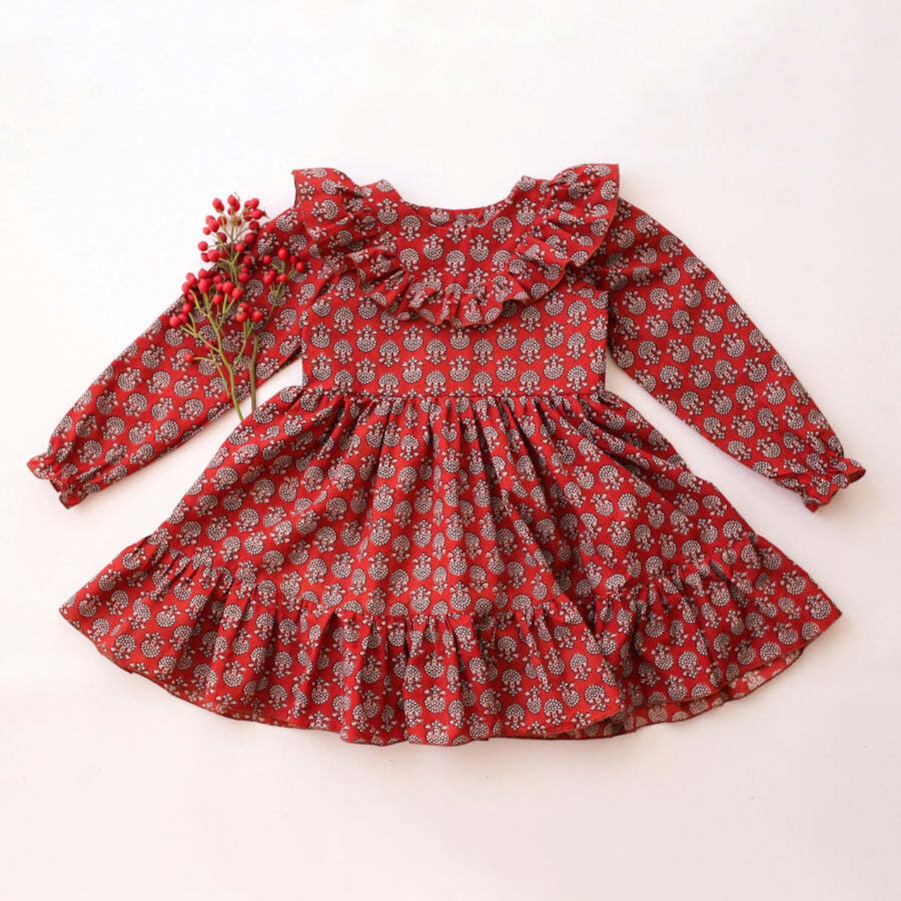 《 予約 》【 Dannie and Lilou 】Festive Florals Long Sleeve Flutter Bodice Dress - HOLIDAY COLLECTION -