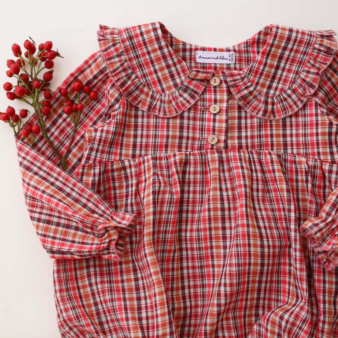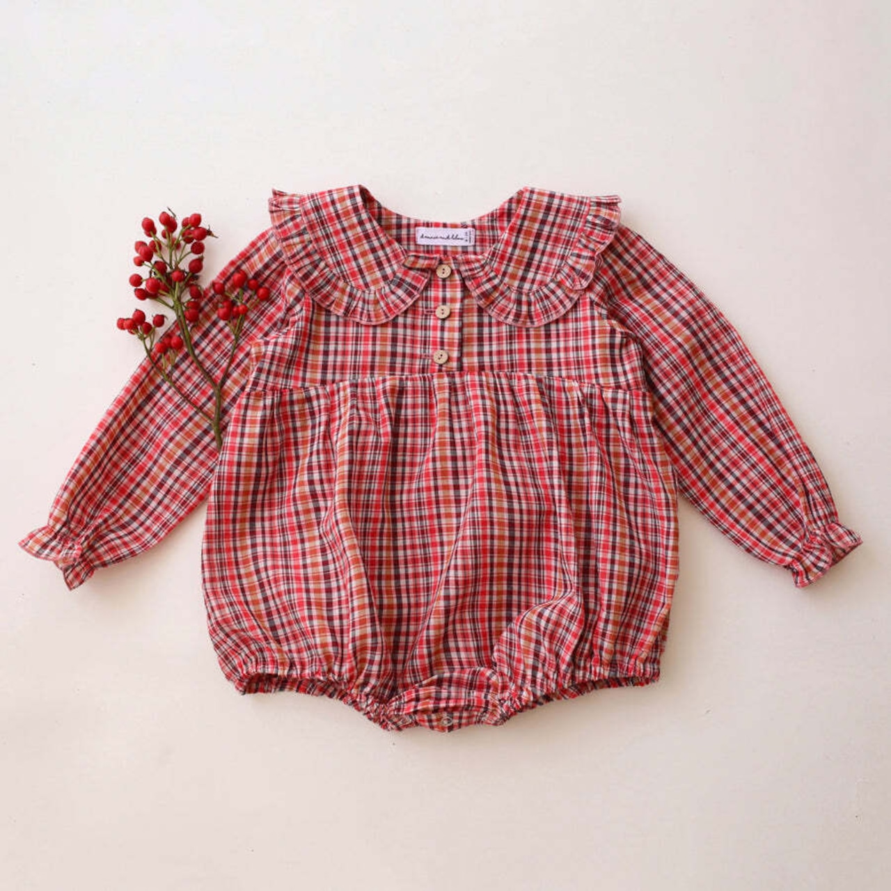 《 予約 》【 Dannie and Lilou 】Holiday Check Cotton Long Sleeve Frilled Collar Bubble Playsuit with Curved Waistline - HOLIDAY COLLECTION -