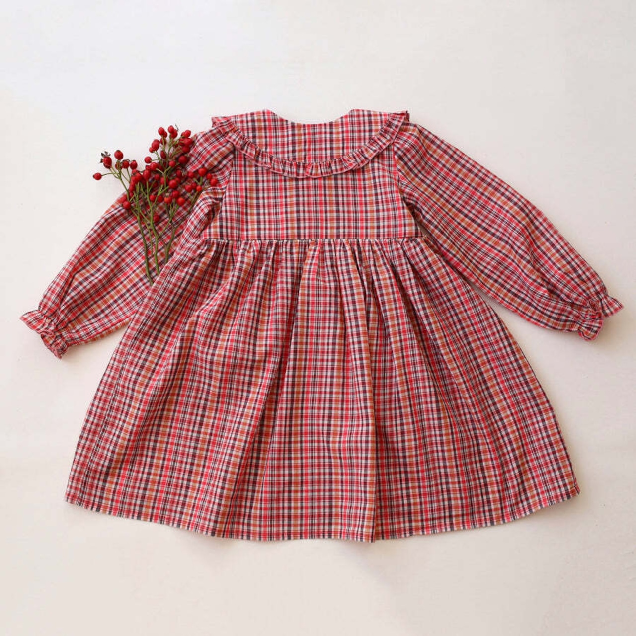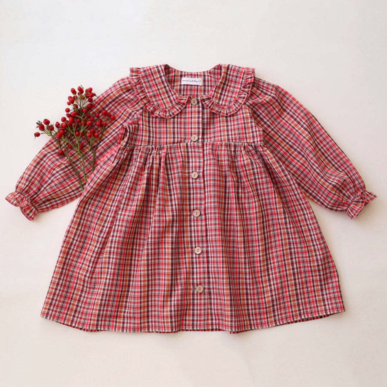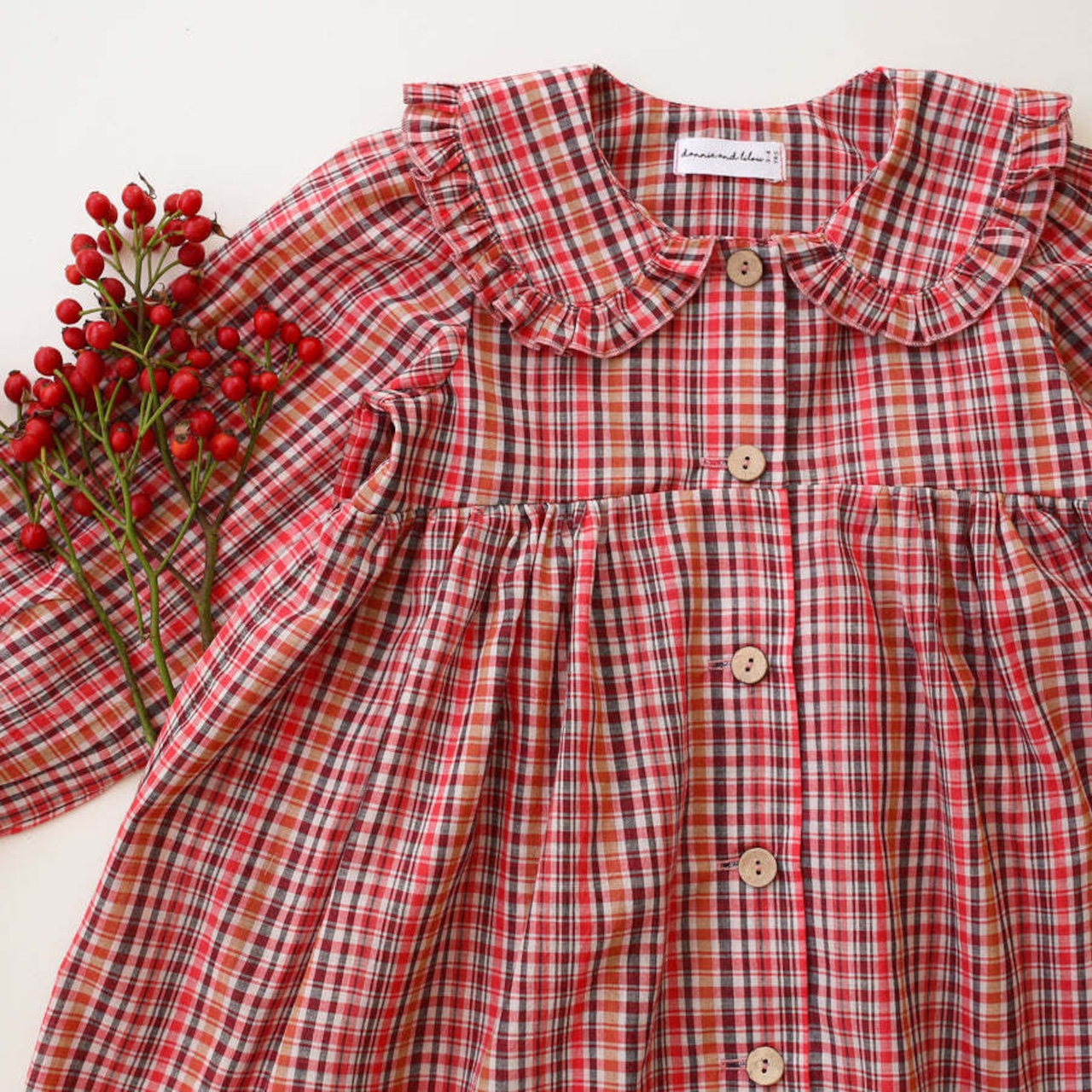 《 予約 》【 Dannie and Lilou 】Holiday Check Cotton Long Sleeve Frilled Collar Dress with Curved Waistline - HOLIDAY COLLECTION -