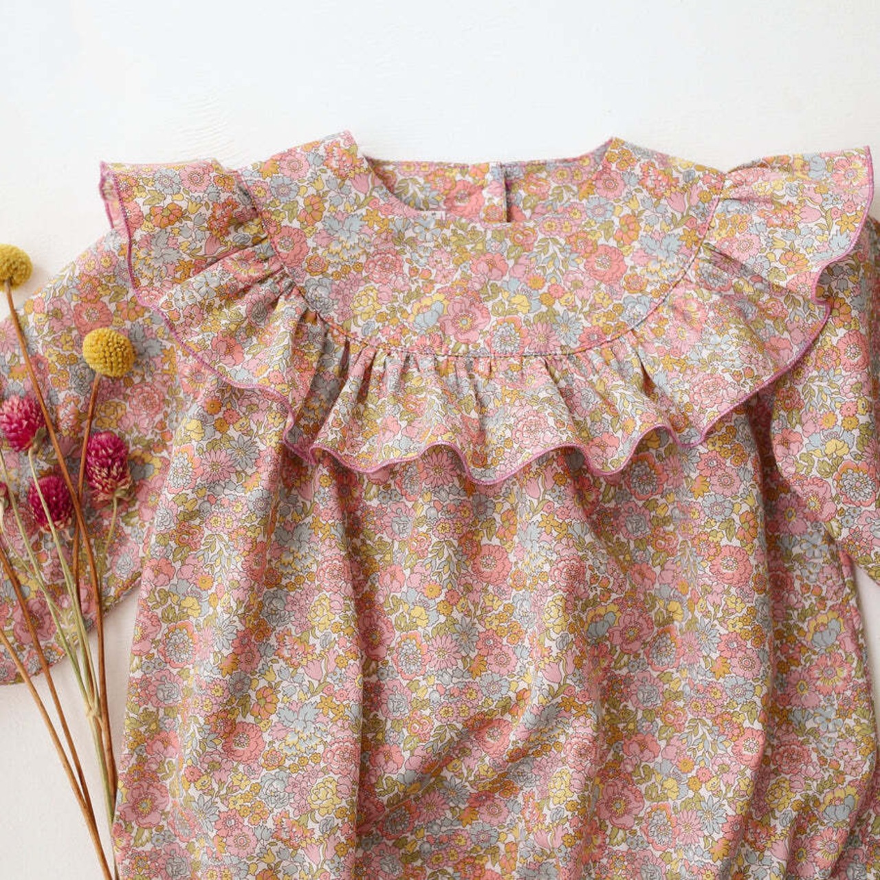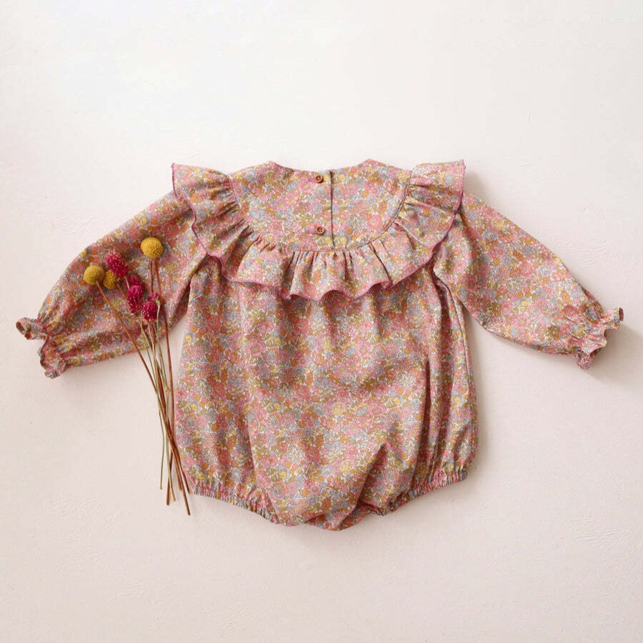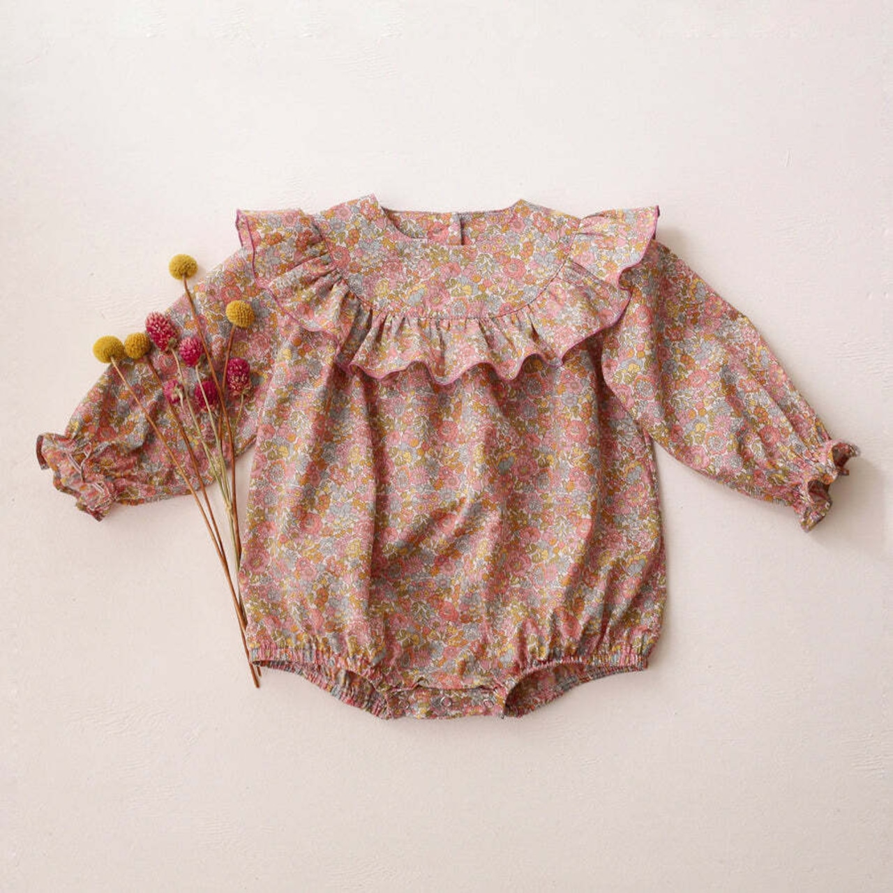 上質な100%コットンのリバティプリント Tana Lawn™ を使用した、やわらかなフリルで縁取られたラウンドヨークが可愛いバブルロンパース。