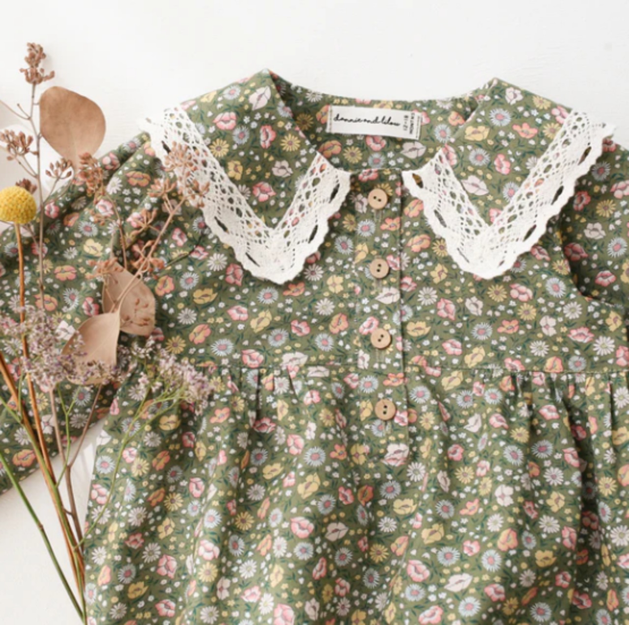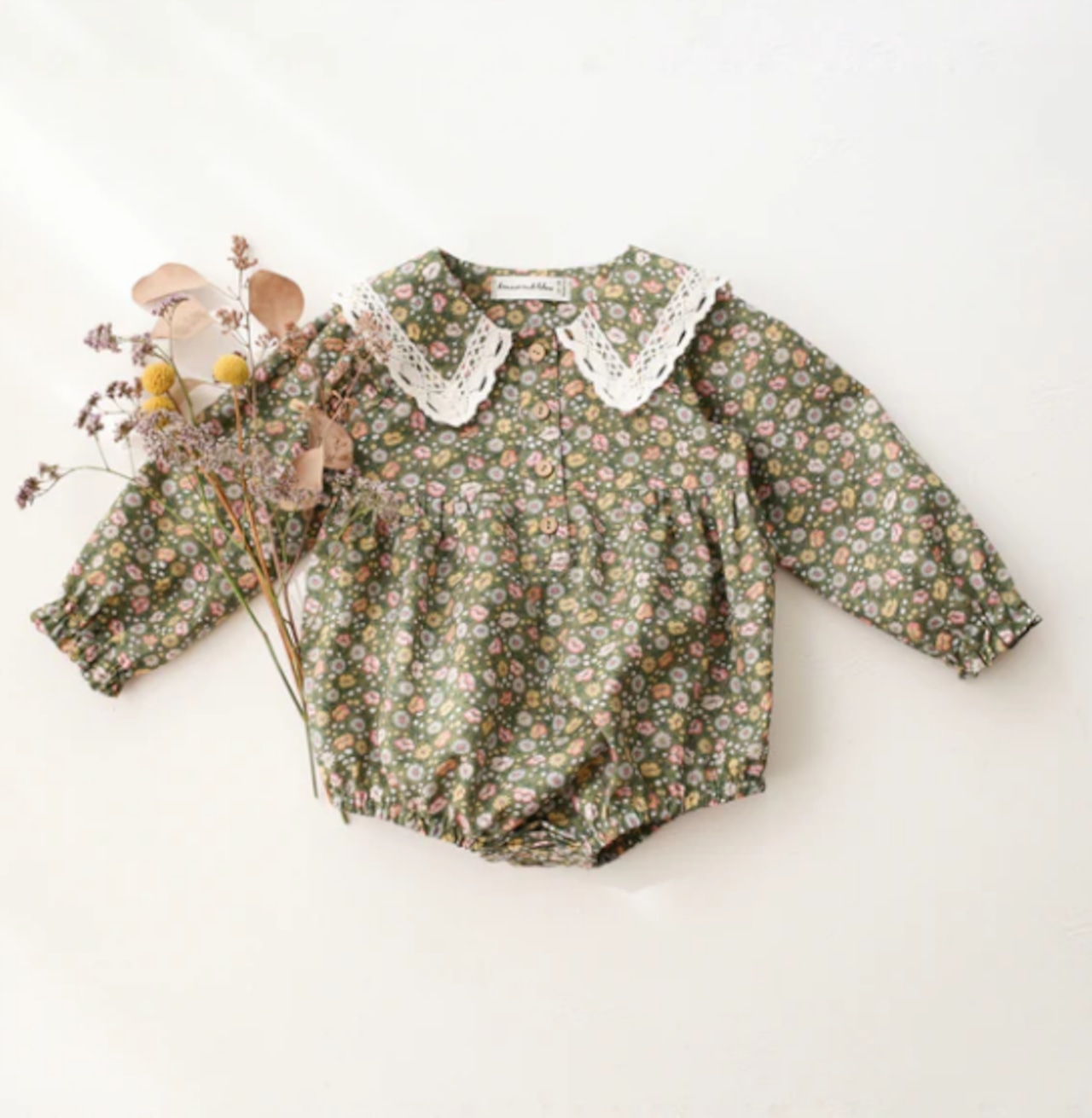 《 予約 》【 Dannie and Lilou × Liberty Print 】Long Sleeve Pointed Collar Bubble Playsuit with Lace