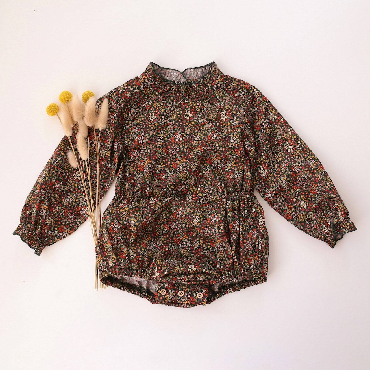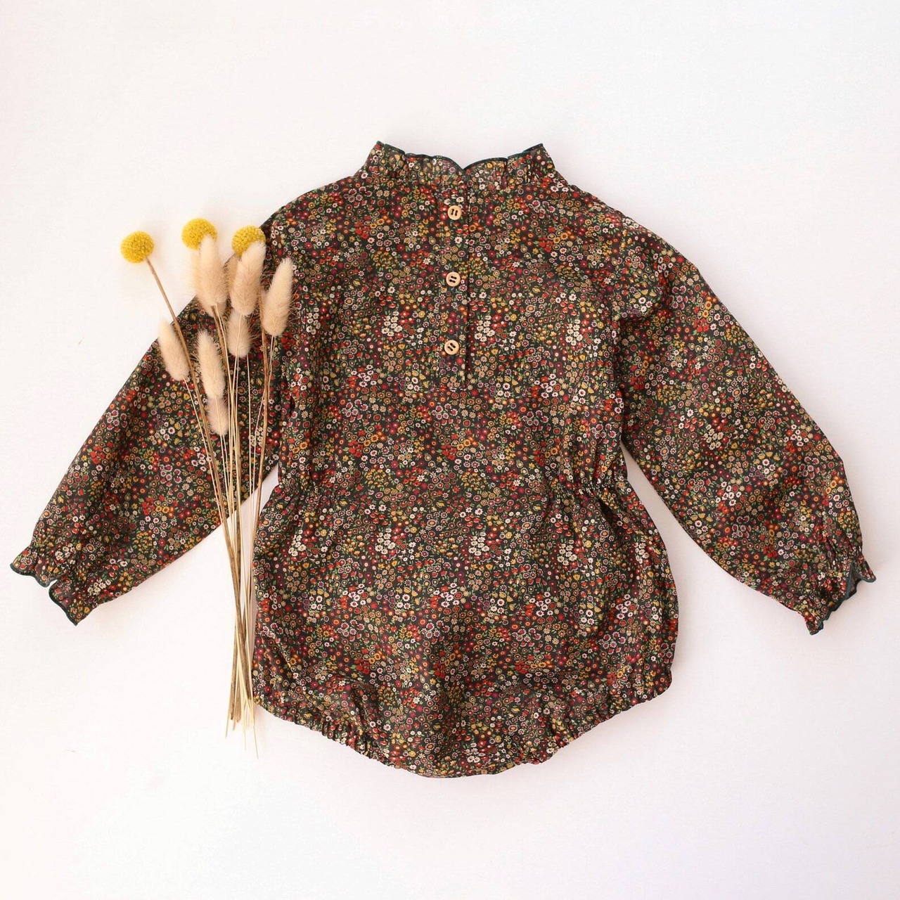 上質な100%コットンのリバティプリント Tana Lawn™ を使用した、高めの襟と、袖口にフリルが施されたシンプルな長袖のバブルロンパース。