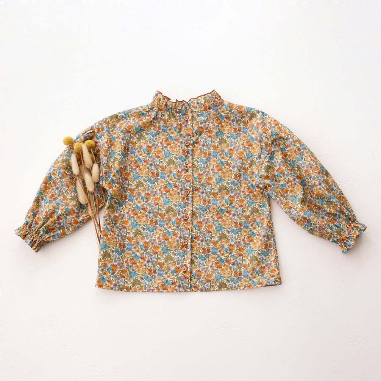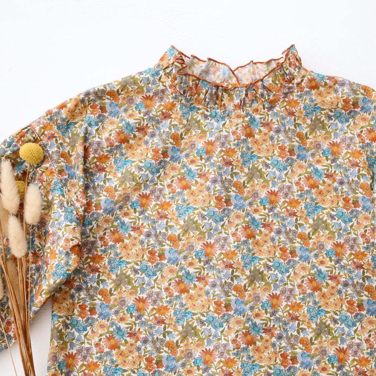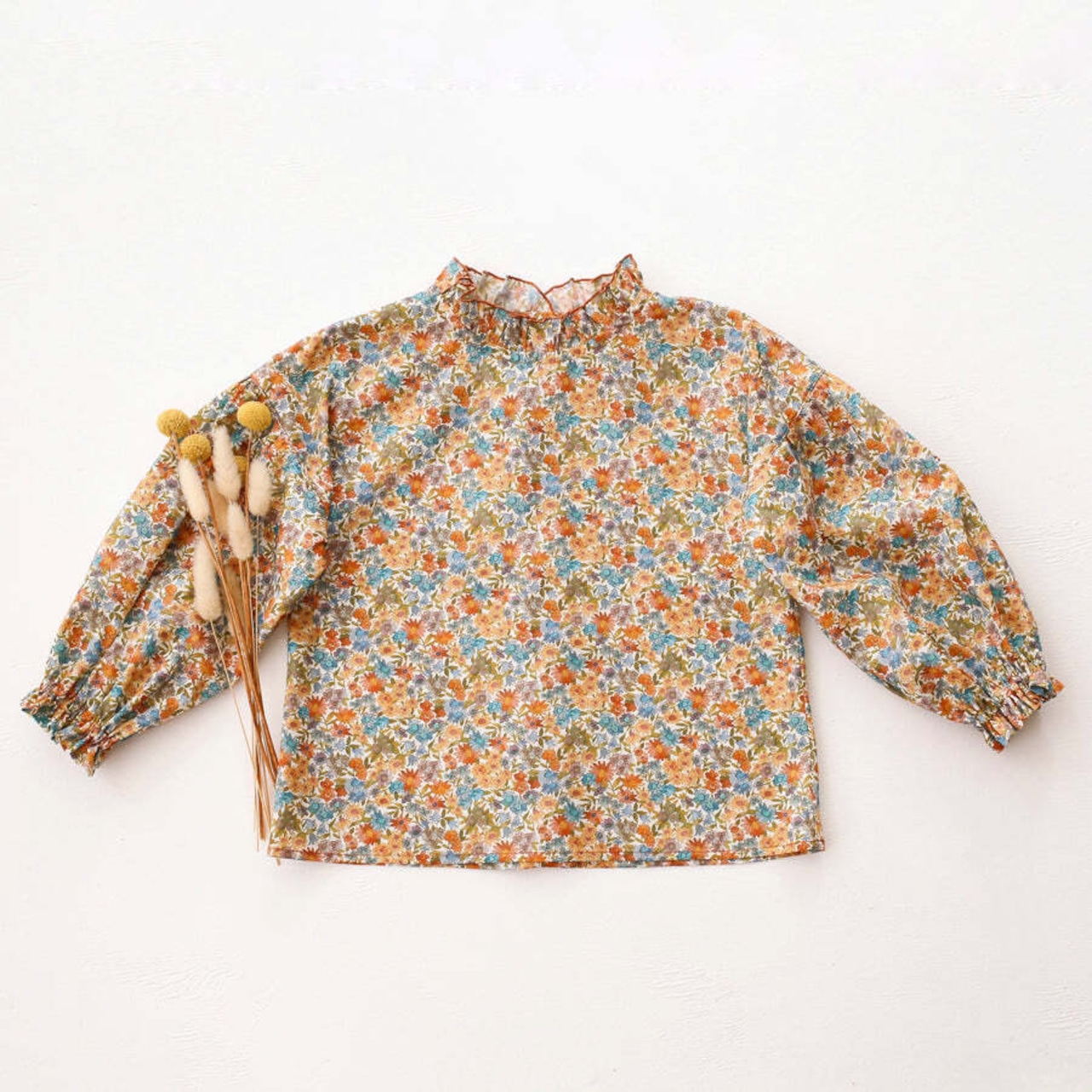 上質な100%コットンのリバティプリント Tana Lawn™ を使用した、フリル付きのネックラインと、袖口まで可愛いバブルスリーブが特徴のブラウス。