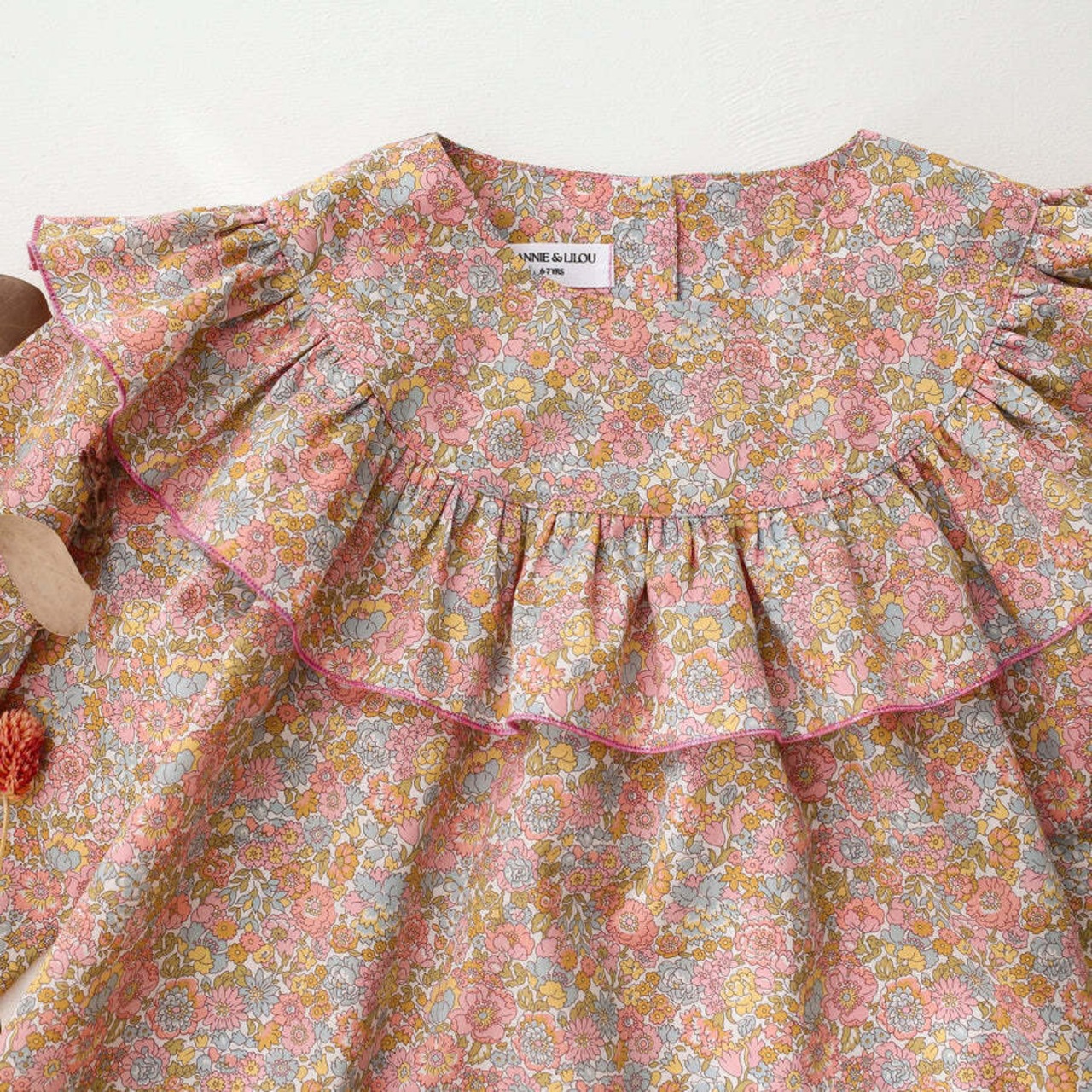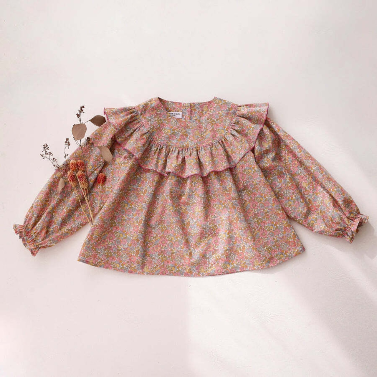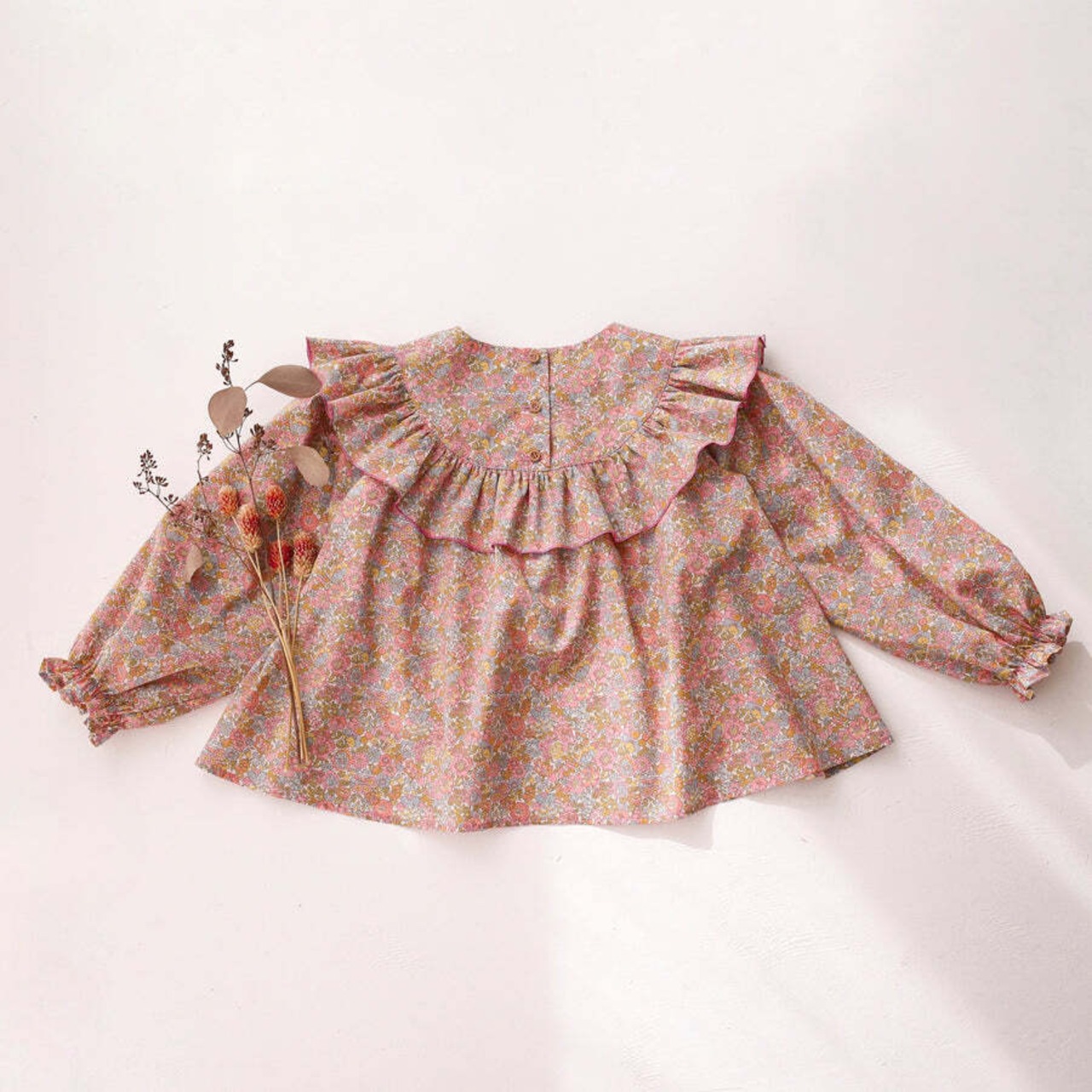 上質な100%コットンのリバティプリント Tana Lawn™ を使用した、やわらかなフリルで縁取られたラウンドヨークと、長袖ギャザーが可愛いブラウス。