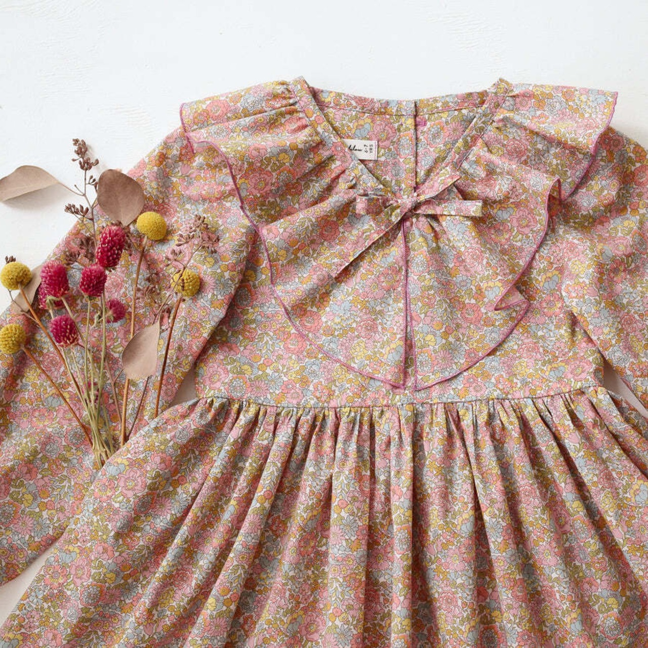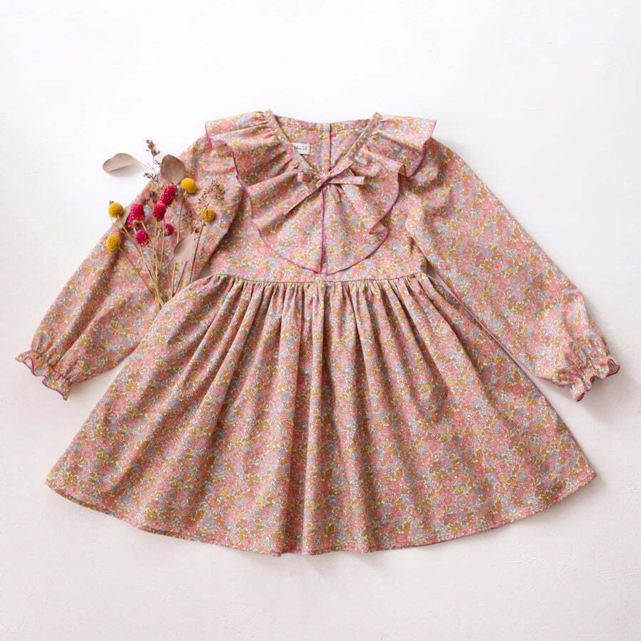 上質な100%コットンのリバティプリント Tana Lawn™ を使用した、ふんわりとしたフリルカラーに、首元の小さなリボンが愛らしいワンピース。