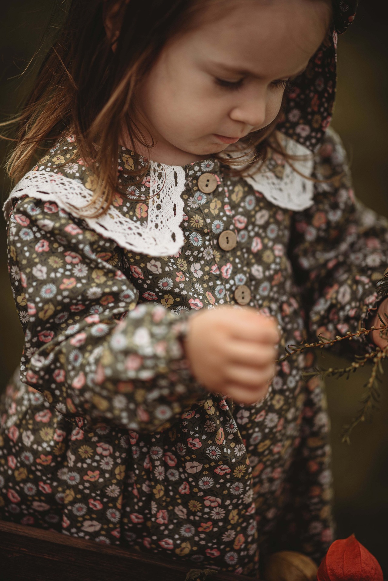 上質な100%コットンのリバティプリント Tana Lawn™ を使用した、繊細なレースをあしらったとんがり襟が印象的なワンピース。