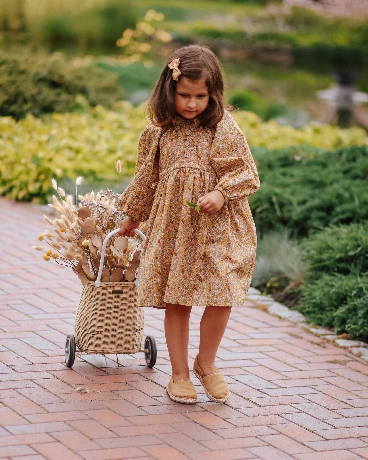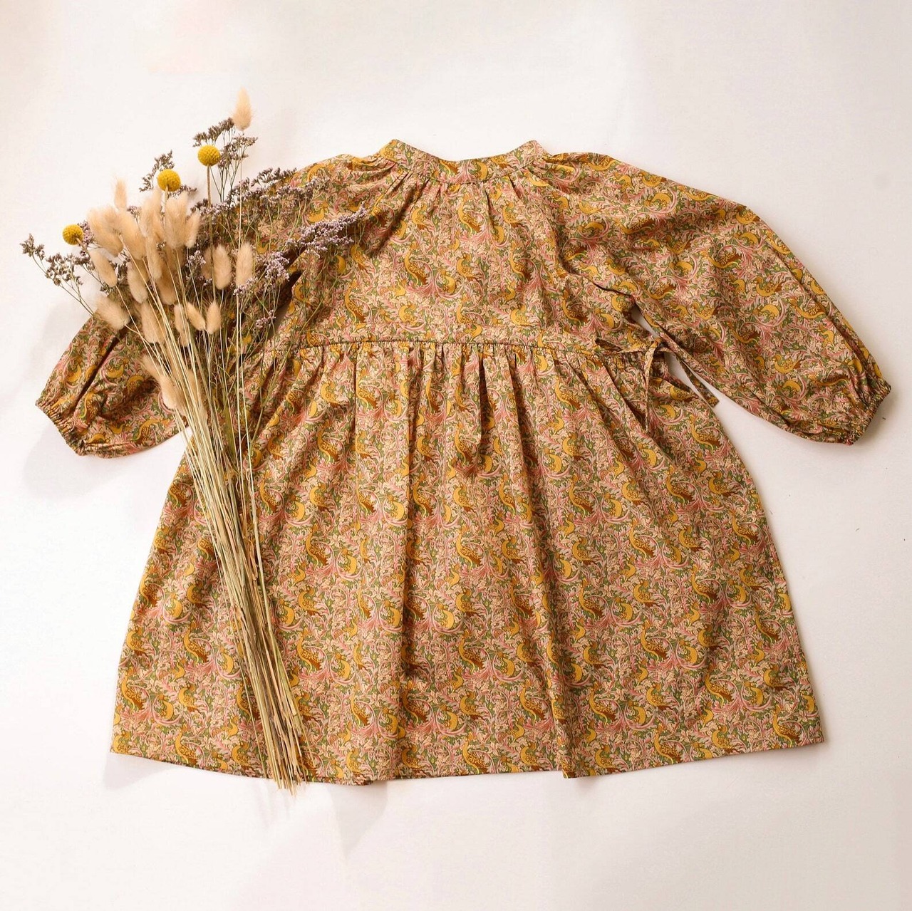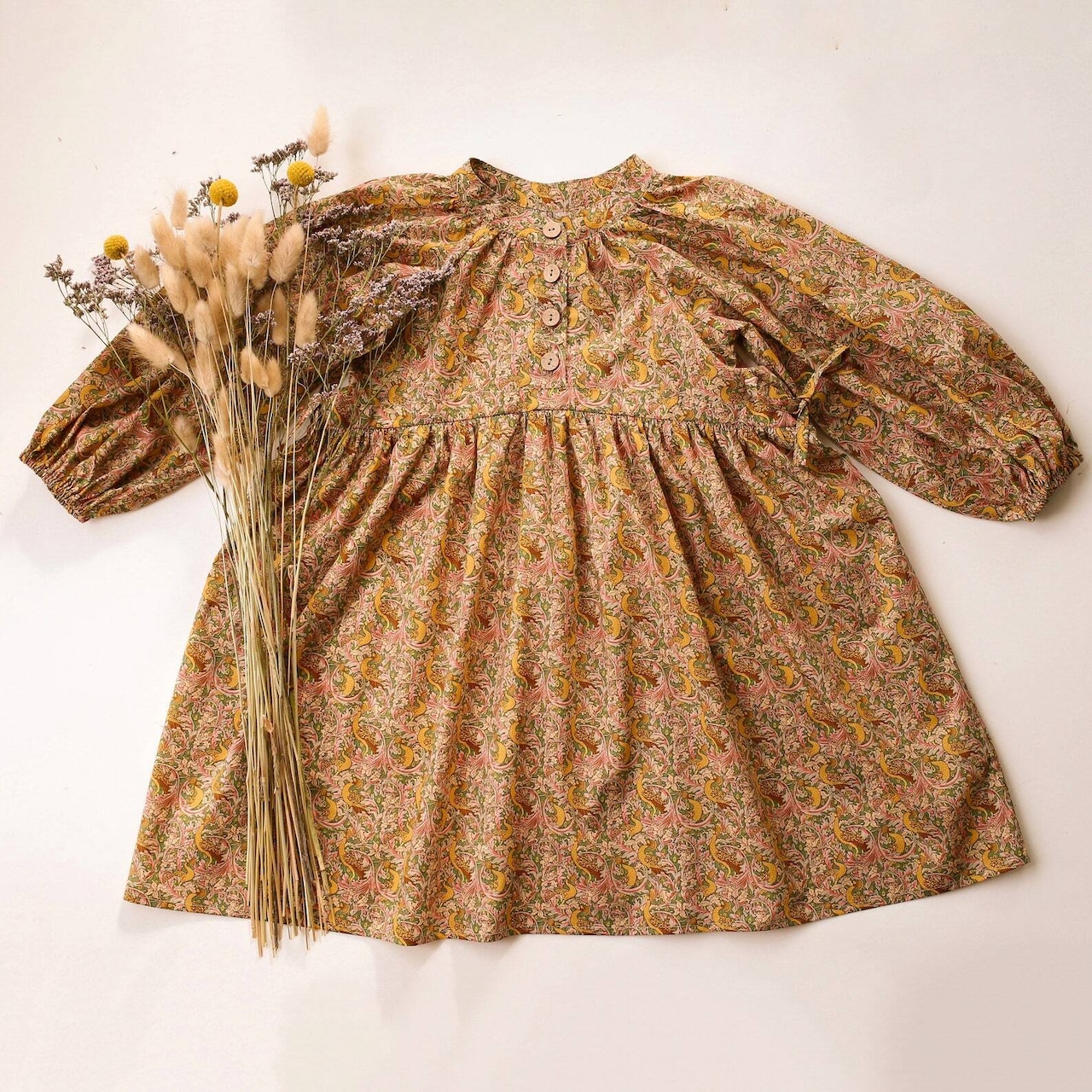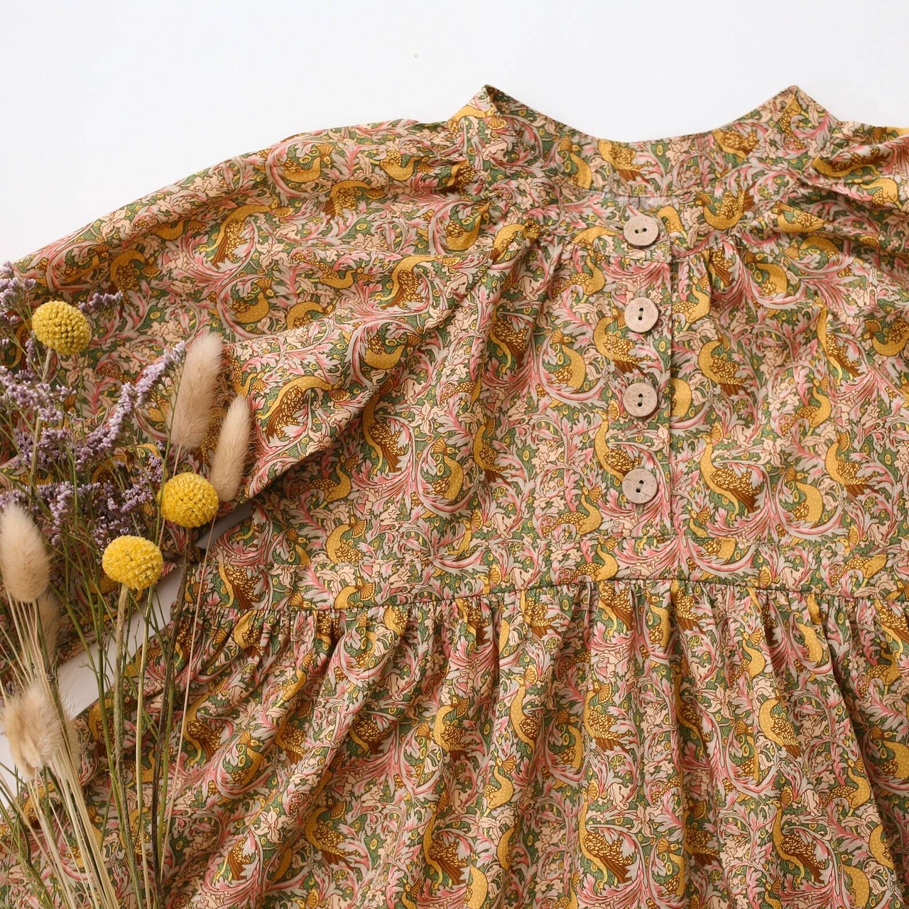 上質な100%コットンのリバティプリント Tana Lawn™ を使用した、ラグランボディにフロントのココナッツボタン、ギャザーを寄せた襟付きネックラインが可愛らしいワンピース。