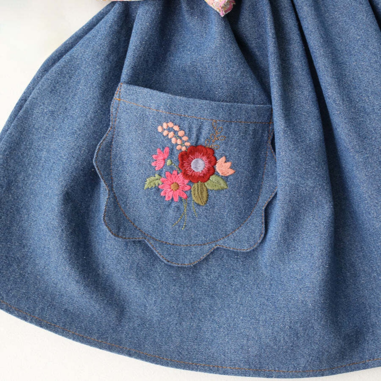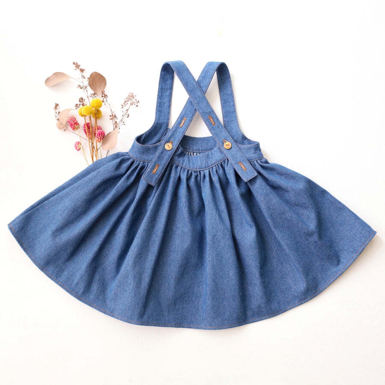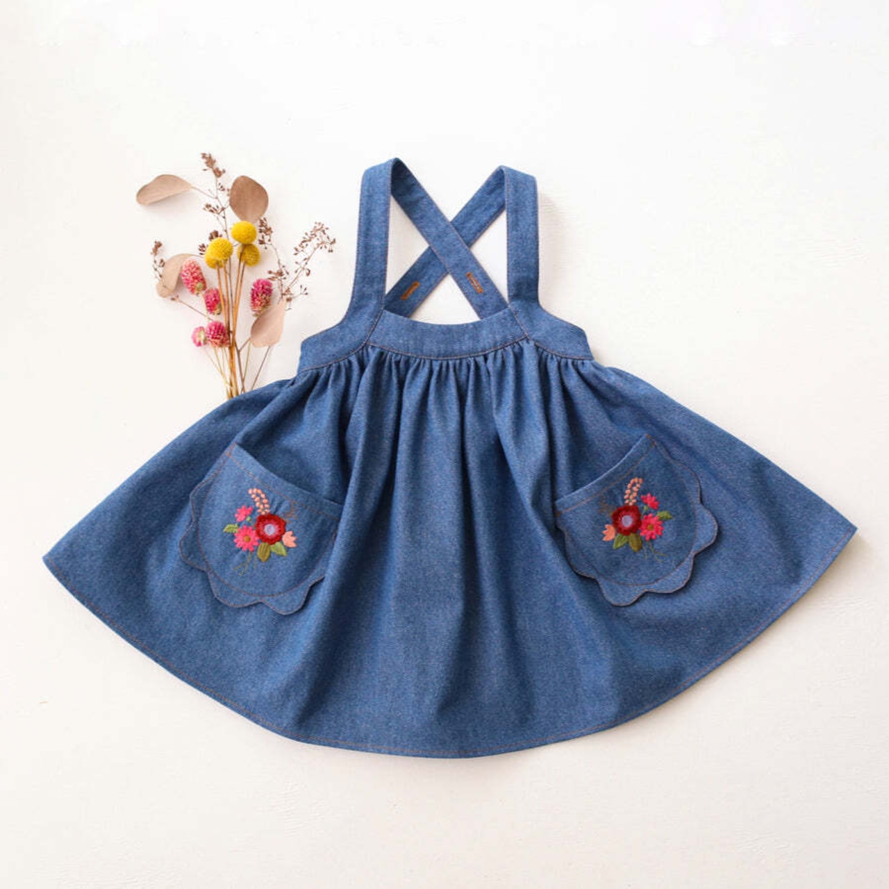3段階で調節可能なストラップとサイドの花びらポケットが可愛いピナフォア(ジャンパースカート)。