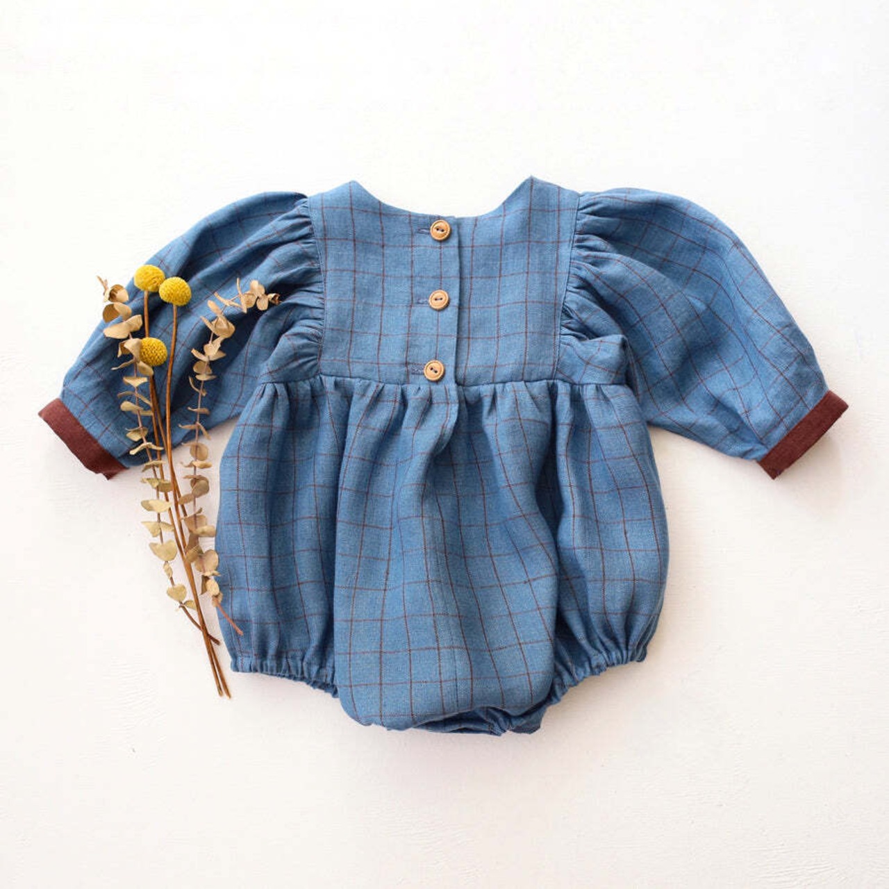 ふんわりパフスリーブで女の子らしさをプラスし、背中のウッドボタンがナチュラルなアクセントに。
