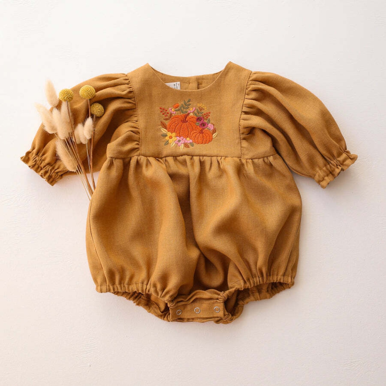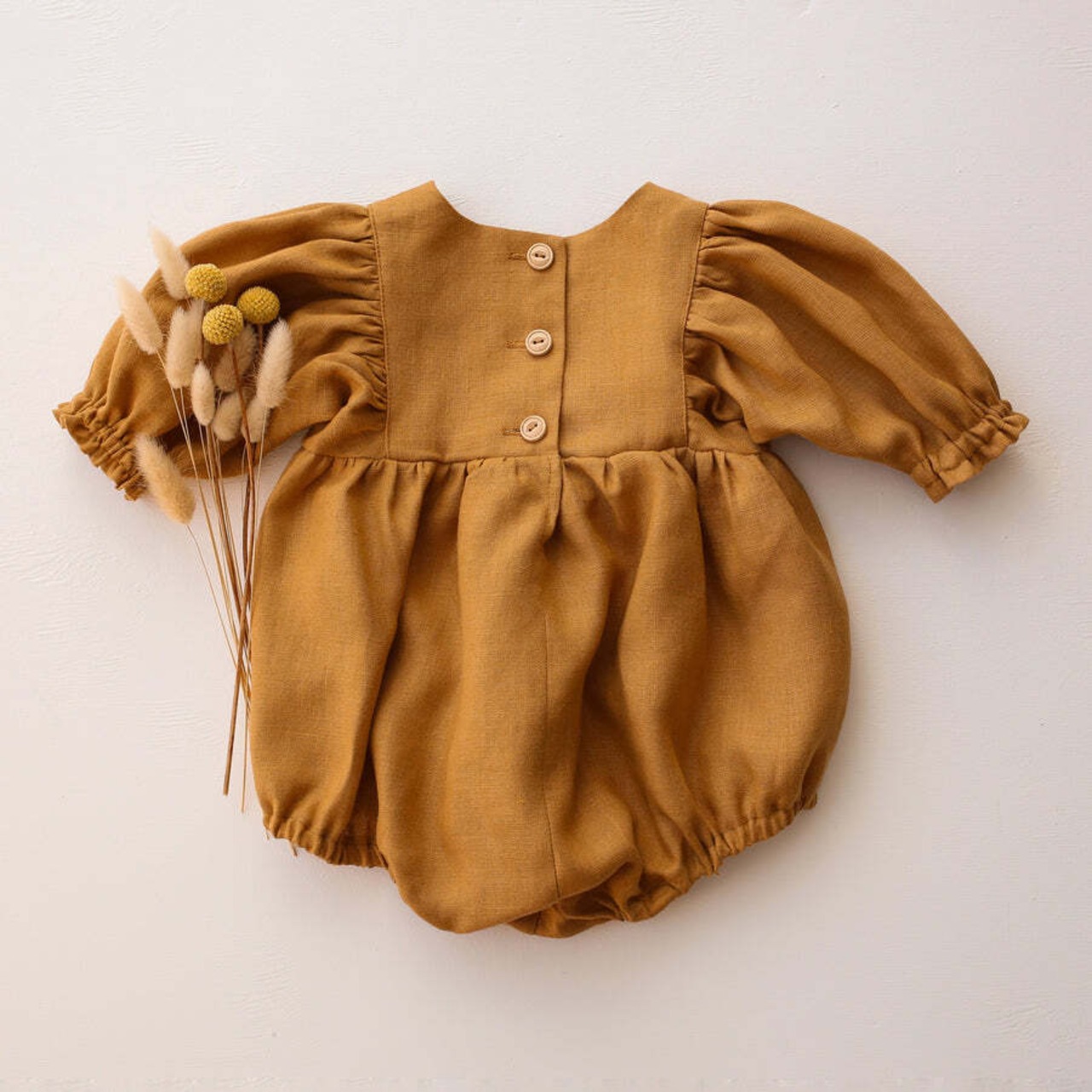 ふんわりパフスリーブが可愛らしいスイートなバブルロンパース。