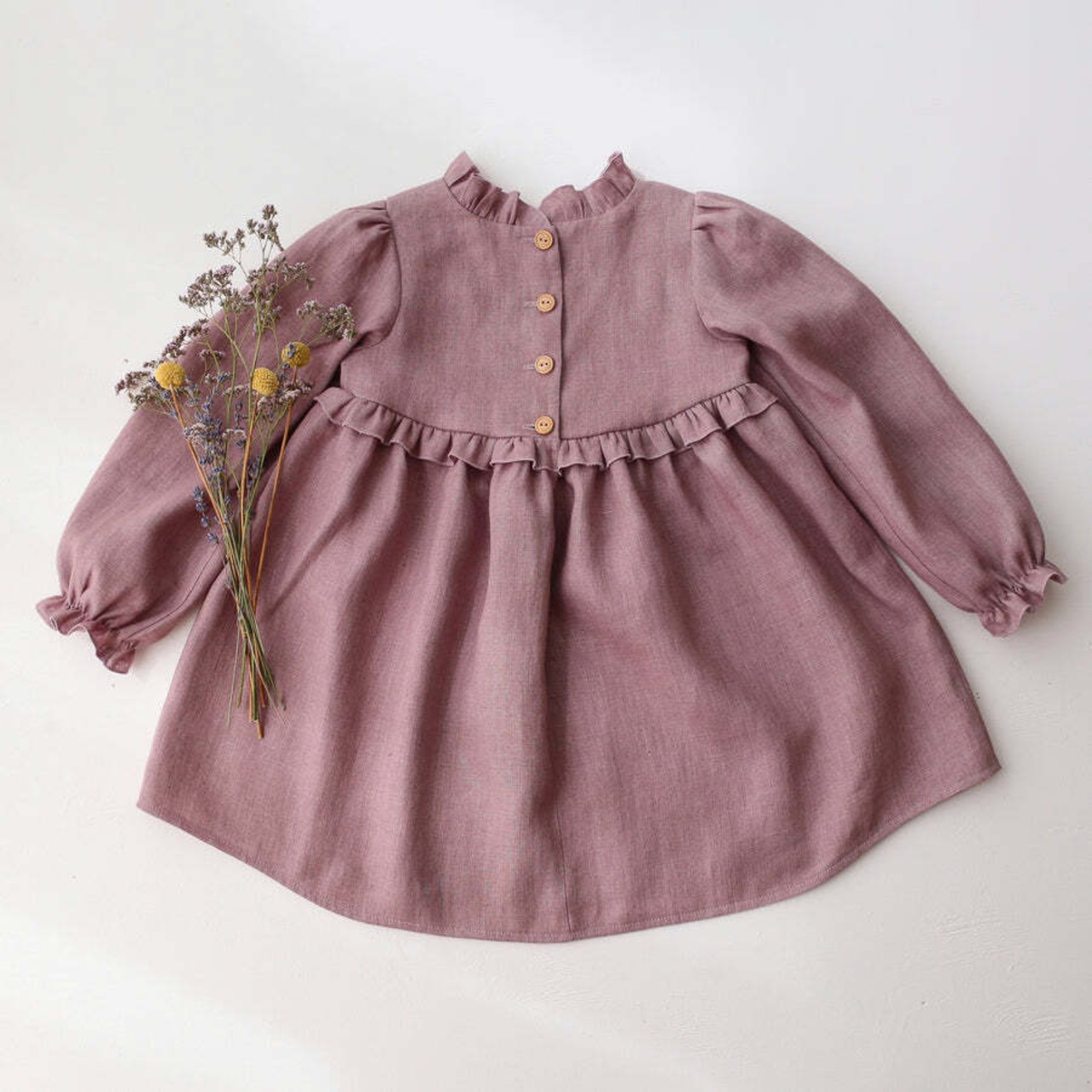 長袖にはギャザーとフリルが上品なアクセントとなり、背中のウッドボタンがナチュラルなポイントに。
