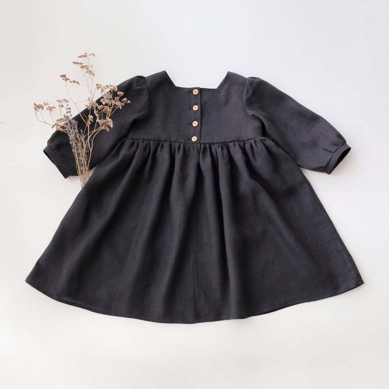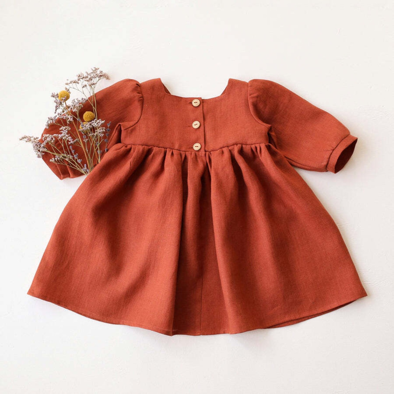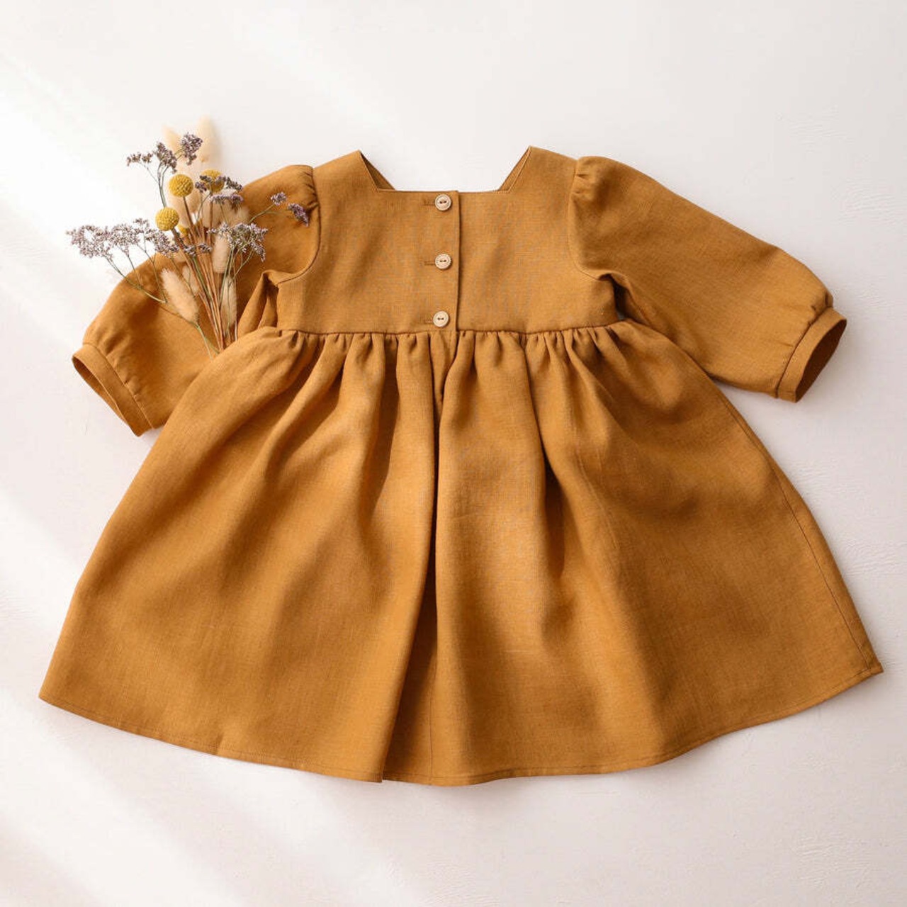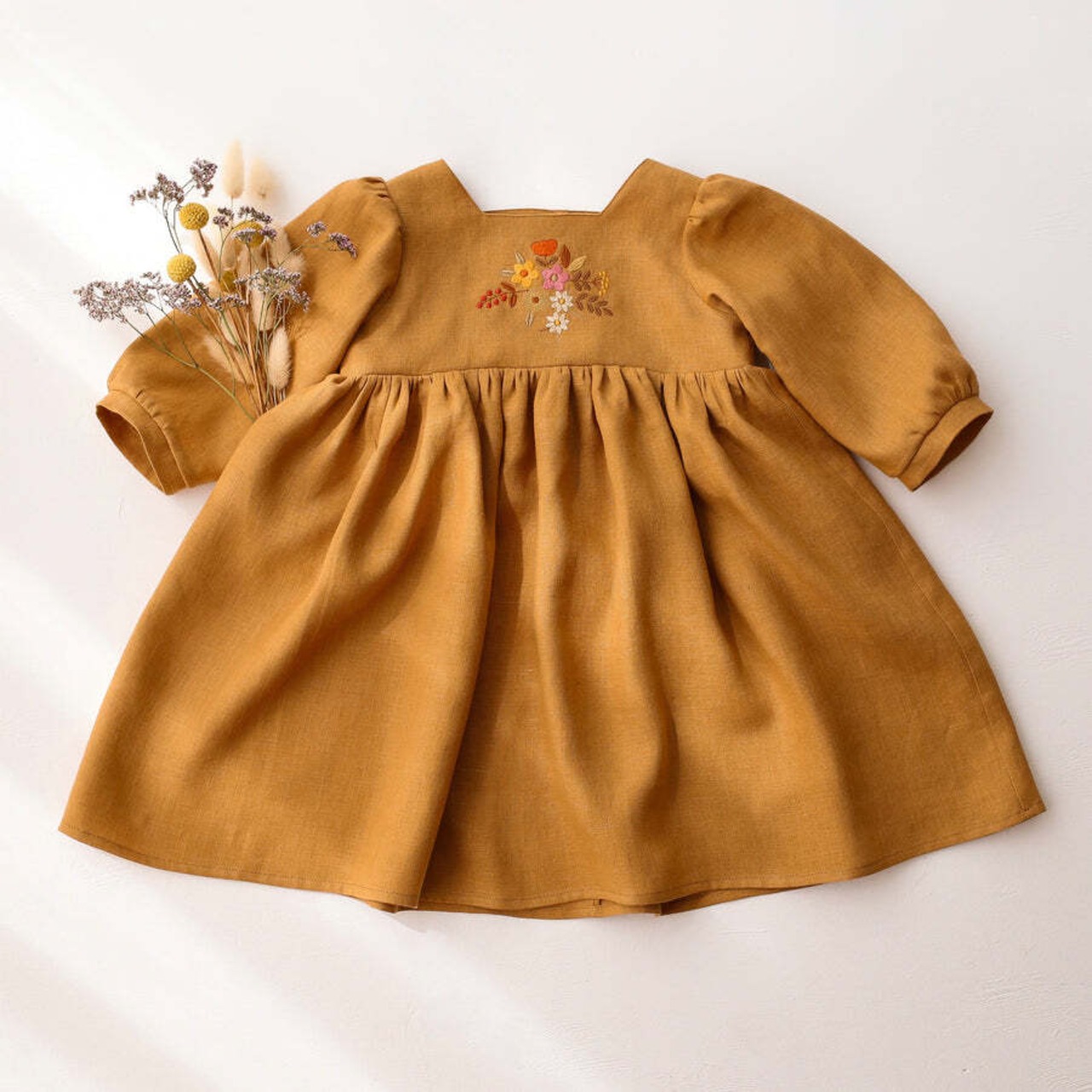 背中のウッドボタンとギャザー入りのスカートがナチュラルな雰囲気を演出し、普段のお出かけにも特別な日にもぴったりの一着です。