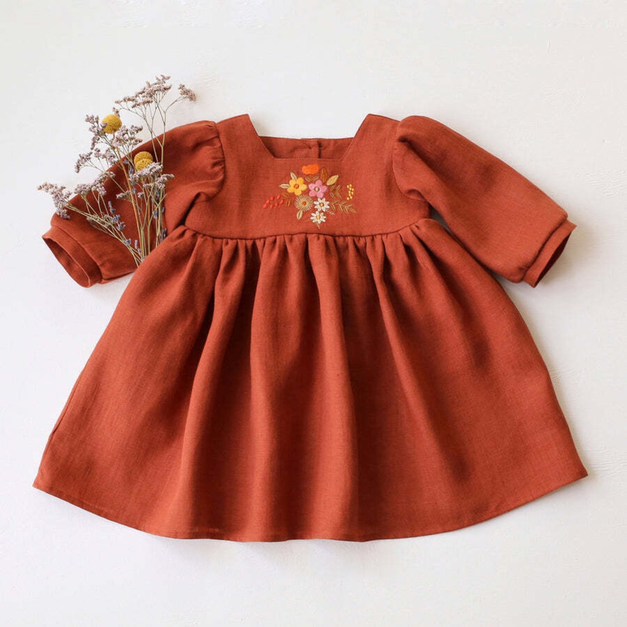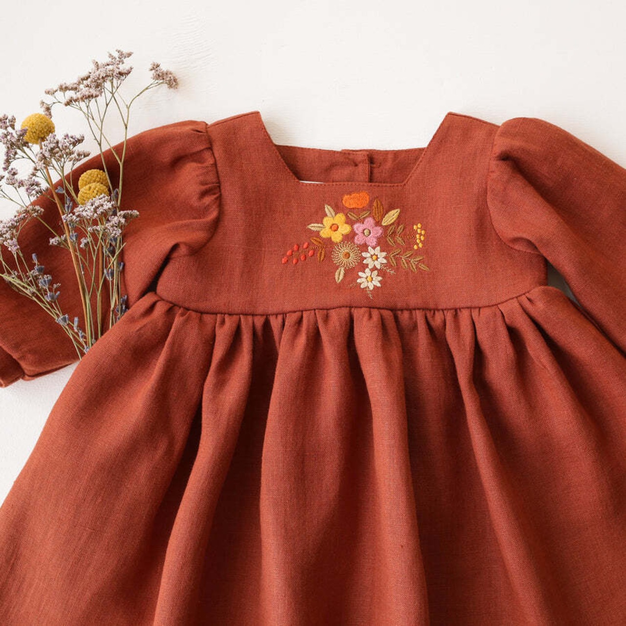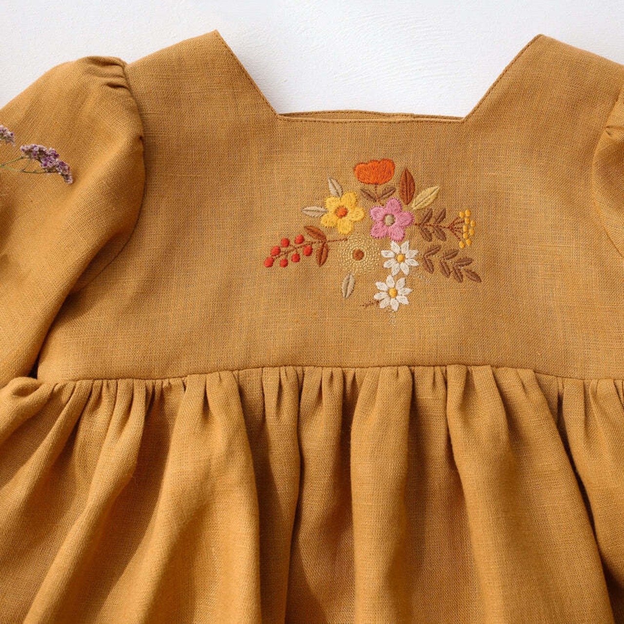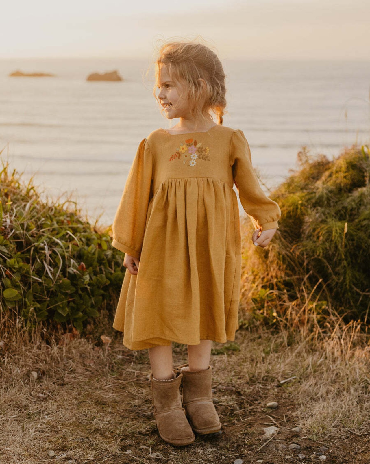背中のウッドボタンとギャザー入りのスカートがナチュラルな雰囲気を演出し、普段のお出かけにも特別な日にもぴったりの一着です。
