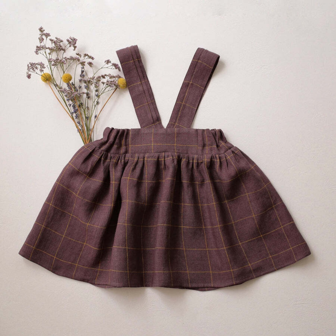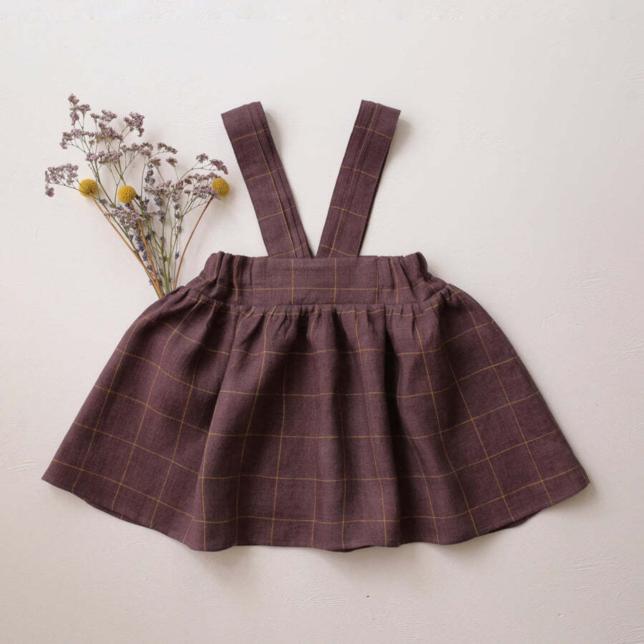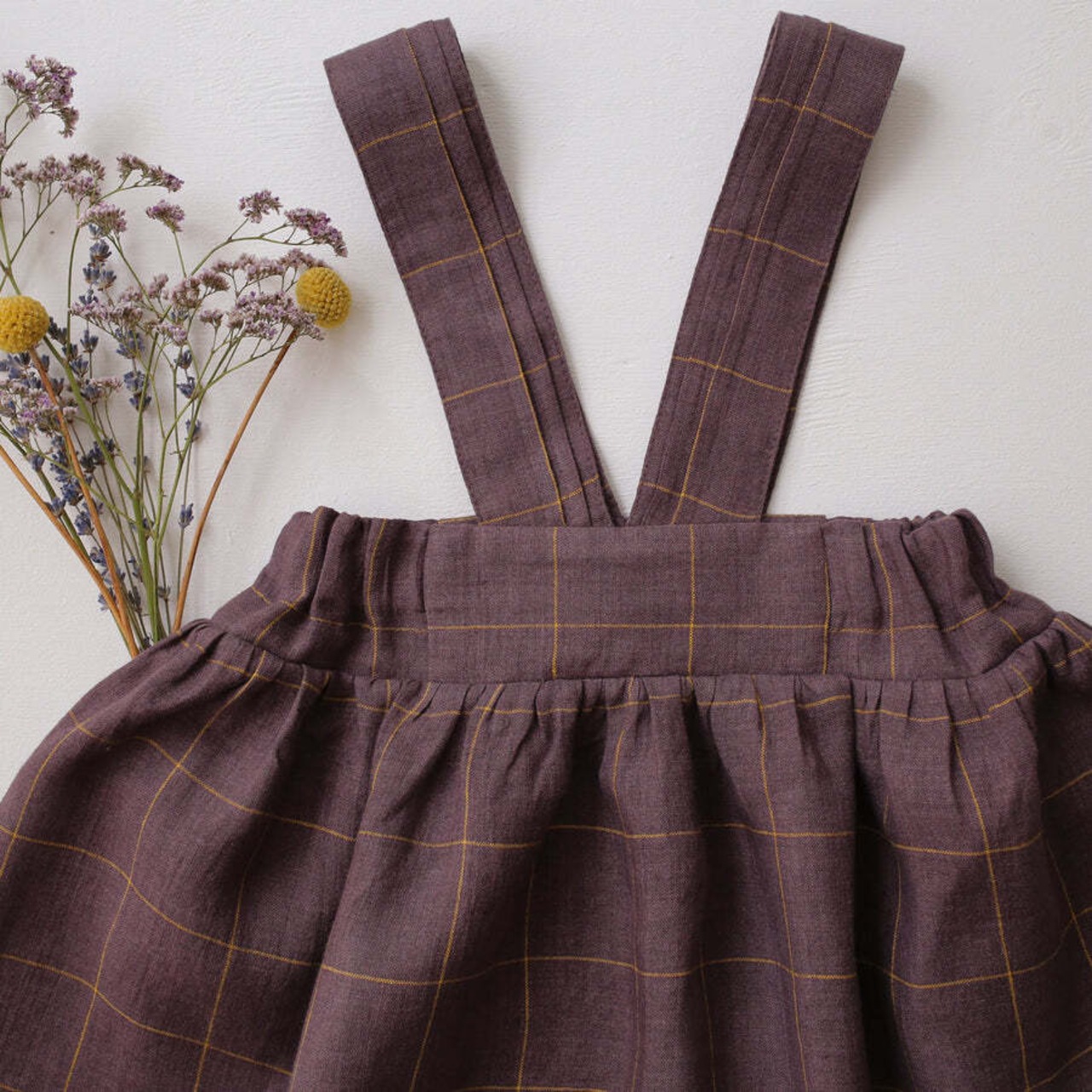 繊細なピンタックが入ったショルダーストラップと、ふんわり広がるギャザースカートが魅力のピナフォア(ジャンパースカート)。シンプルながらも上品さを感じさせるデザインで、特別な日のお出かけにも、普段のコーディネートにも合わせやすい一枚です。