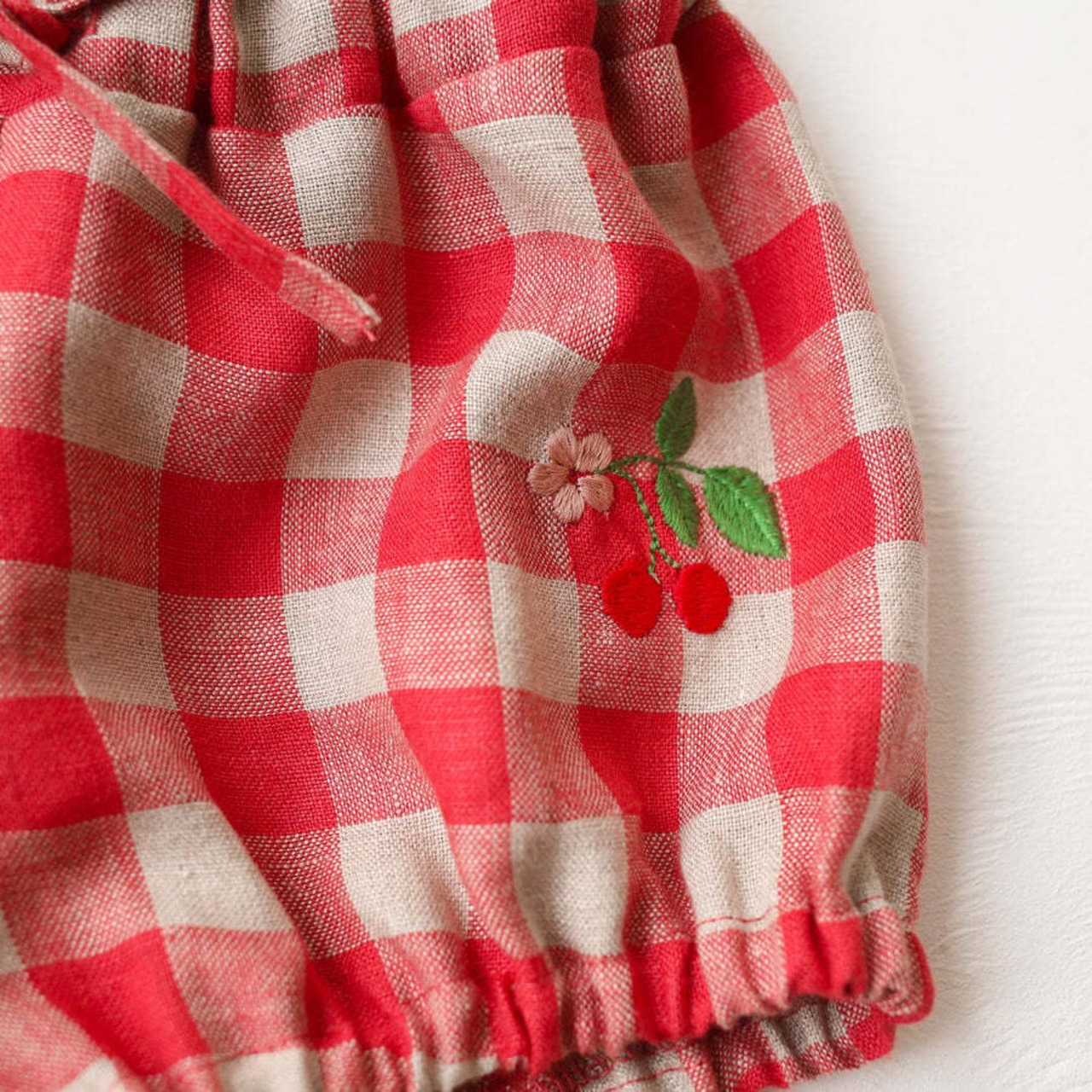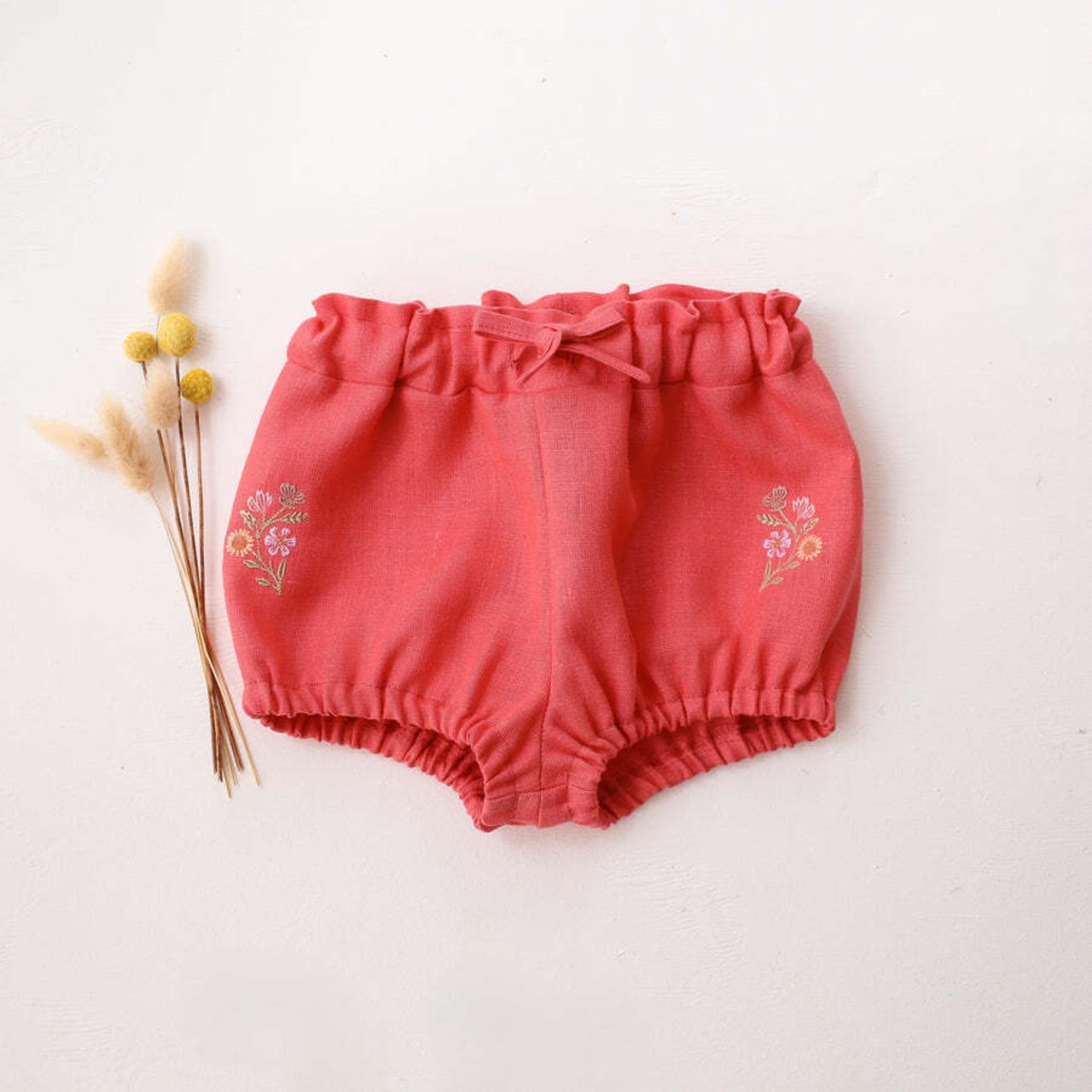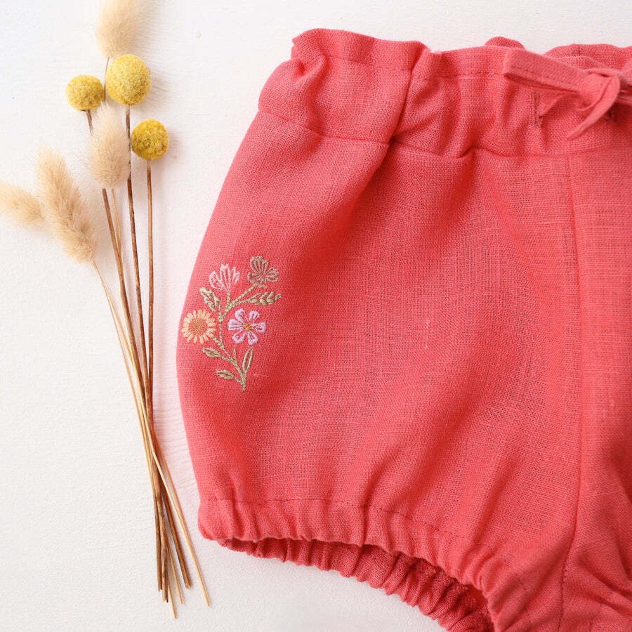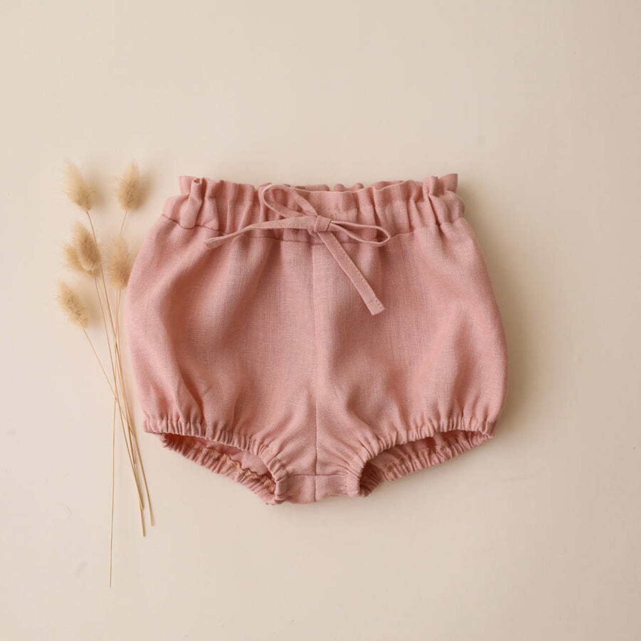 フロントにはリボンのディテールをプラスし、脚周りもゴム入りで動きやすく、ふんわりとしたシルエットが愛らしい一枚です。