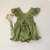 ふんわりとしたショルダーと裾のフリルが可愛らしい印象のロンパース。