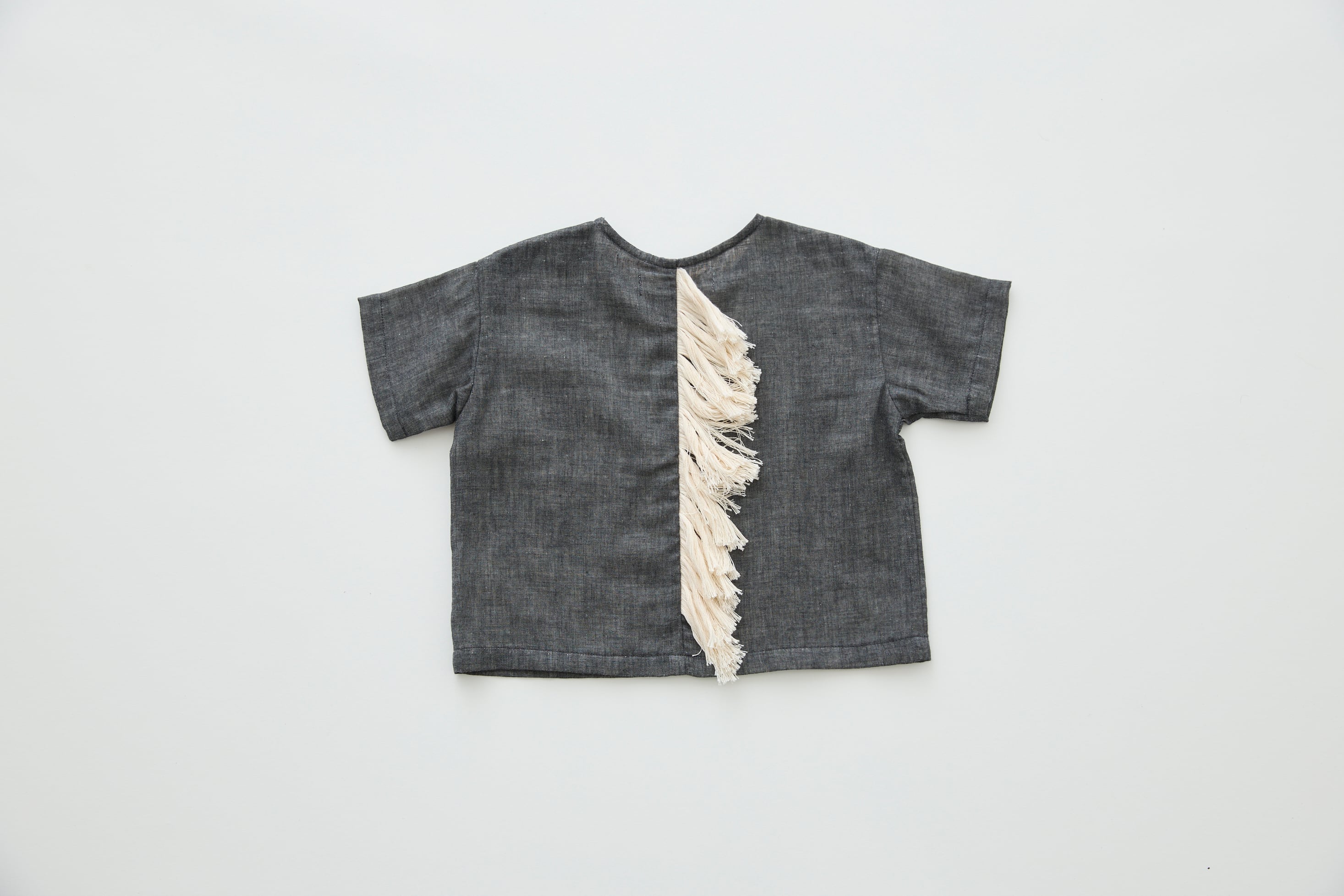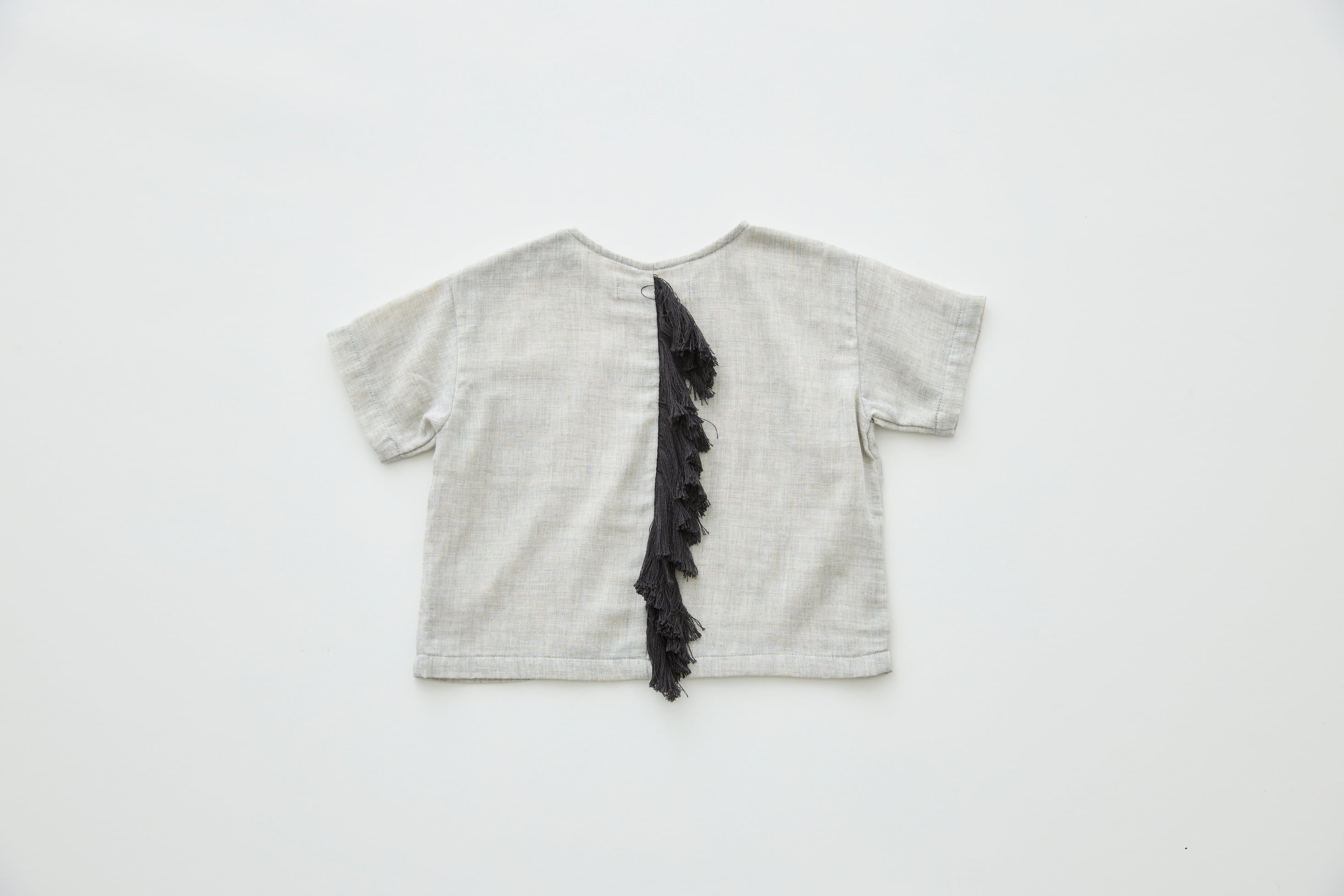 コットン100%の柔らかな⼆重ガーゼのTシャツの背中に、コットン⽷のフリンジをけもののたてがみのように付けたデザイン。