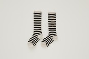 ストライプの濃淡の配⾊も美しいハイソックスは、コーディネートを⾜元からグレードアップさせてくれます。