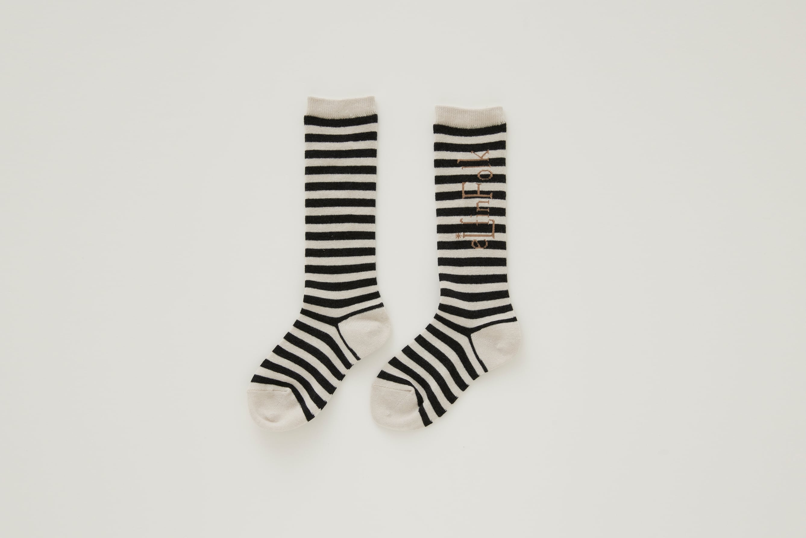 コットン⽷でストライプとブランドロゴを編みこんだハイソックス。