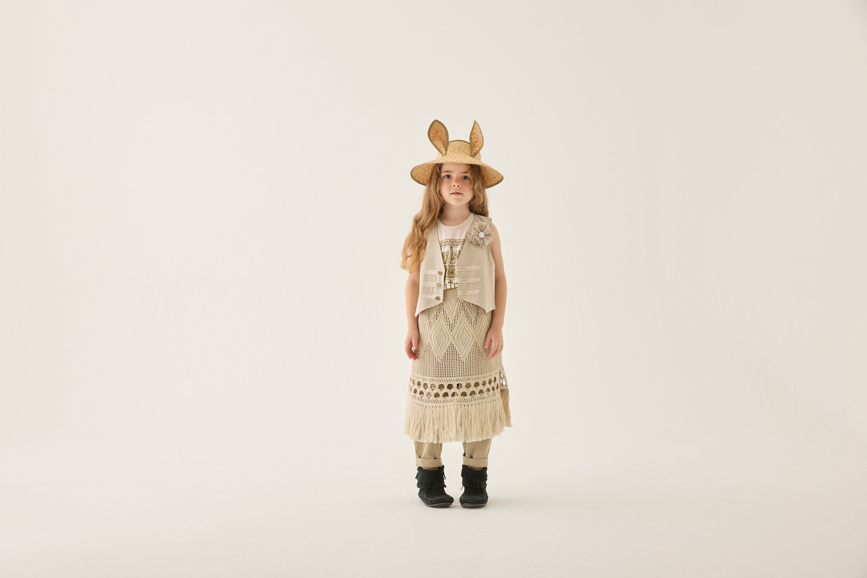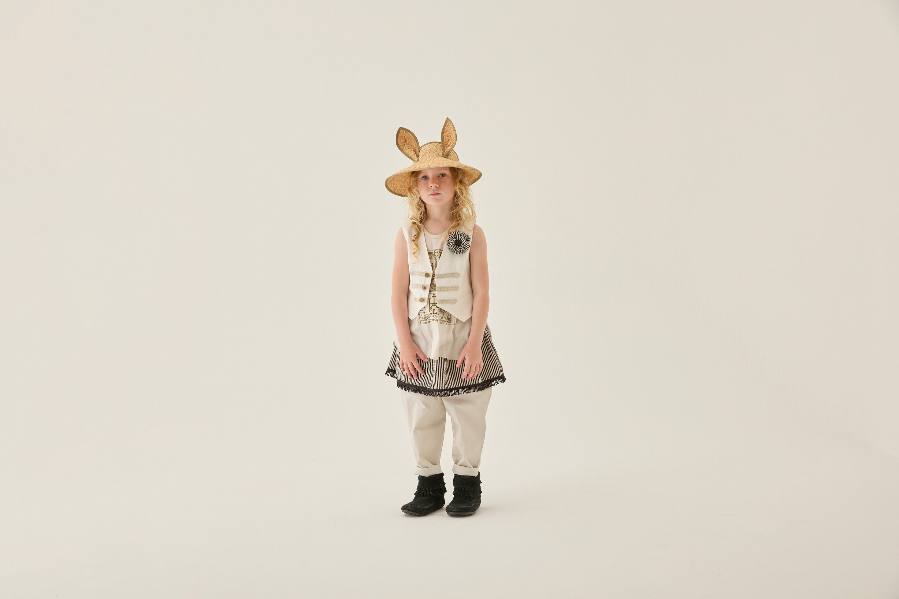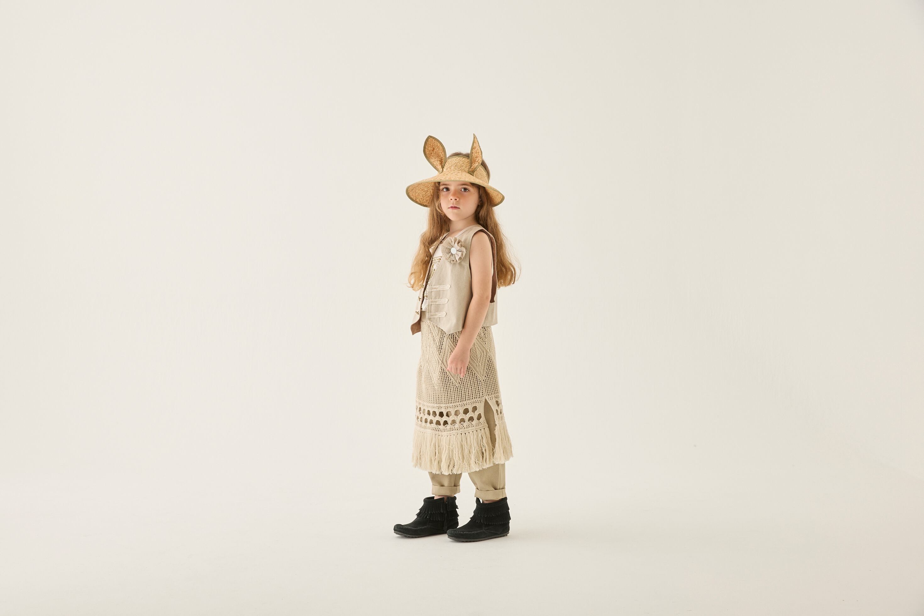 タイルの柄をプリントしたテキスタイル、ドラゴンと王国のイラストをプリントしたTシャツ、背中にたてがみのあるガーゼのトップス、⽿付きのビーストバケットハットなど異世界の住⺠を表現したアイテムに。今季初登場の⽔着にも、ポルトガルの古いタイルをプリントしたテキスタイルを使っています。