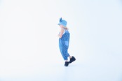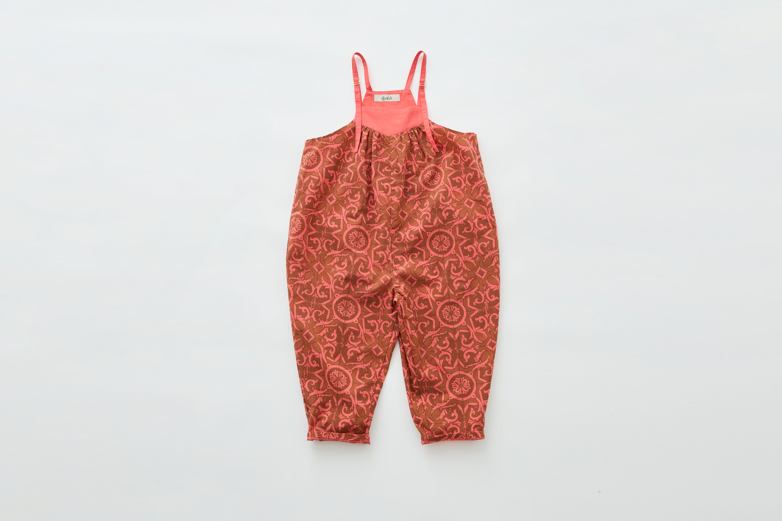 オーバーオールは⻑さ調整可能の細い肩紐に、たっぷりした⾝頃、サルエルシルエットが特徴。
