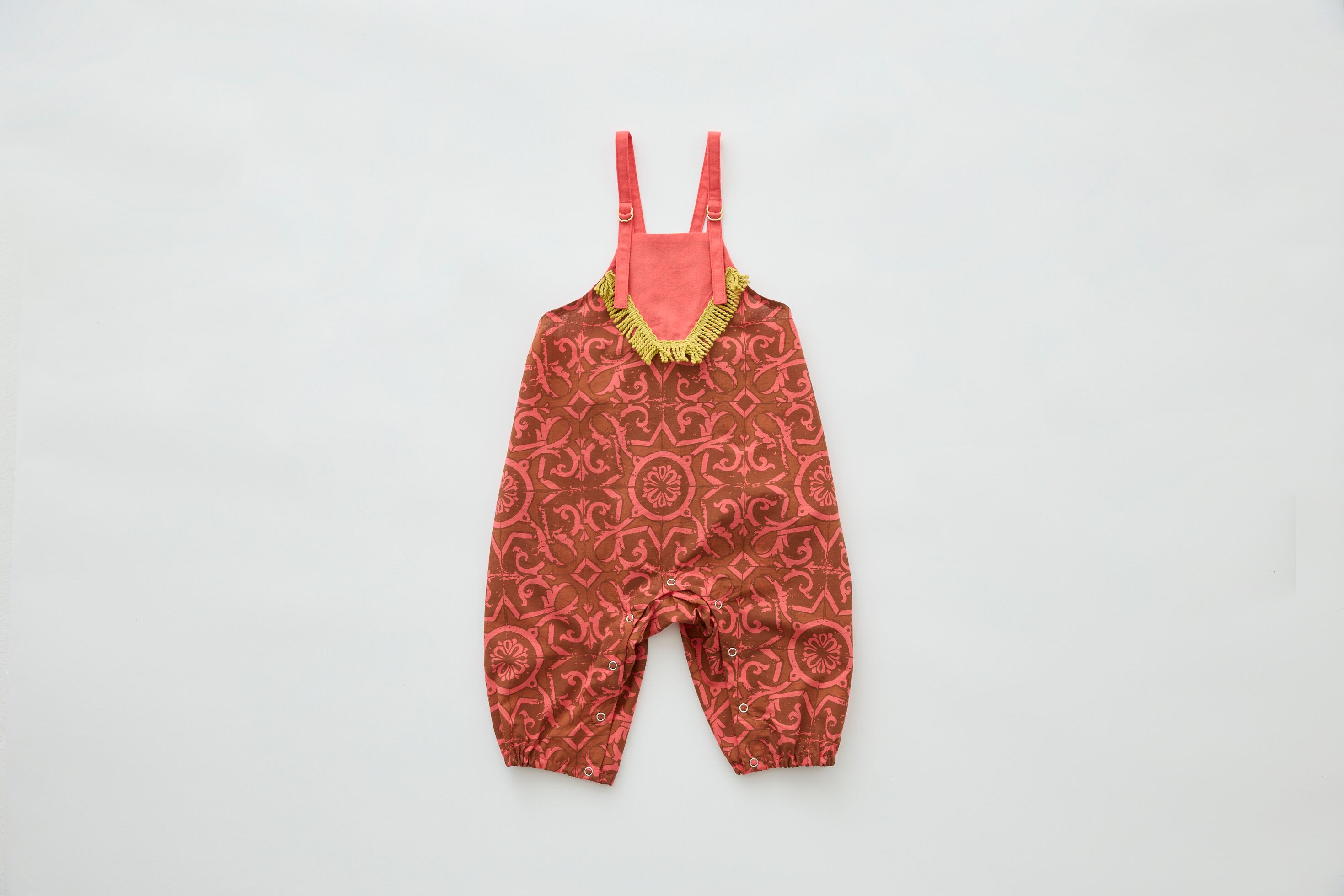 ベビーロンパースは胸元にフリンジを飾り、肩から背中にかけて華奢な紐がデザインされ、D管で⻑さ調整も可能。股下にはオムツ⽤のスナップ開きもあり、ママに嬉しいデザイン。