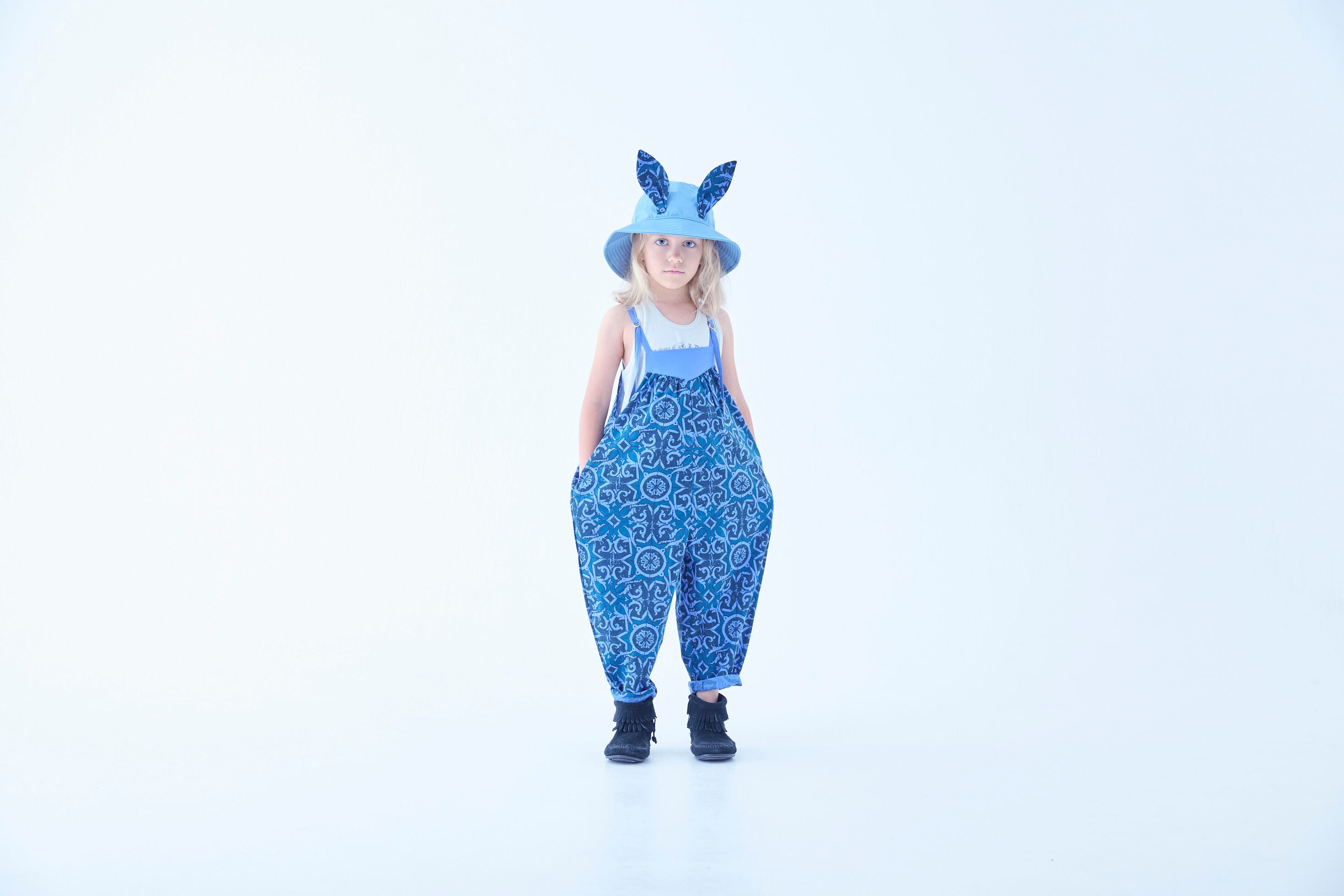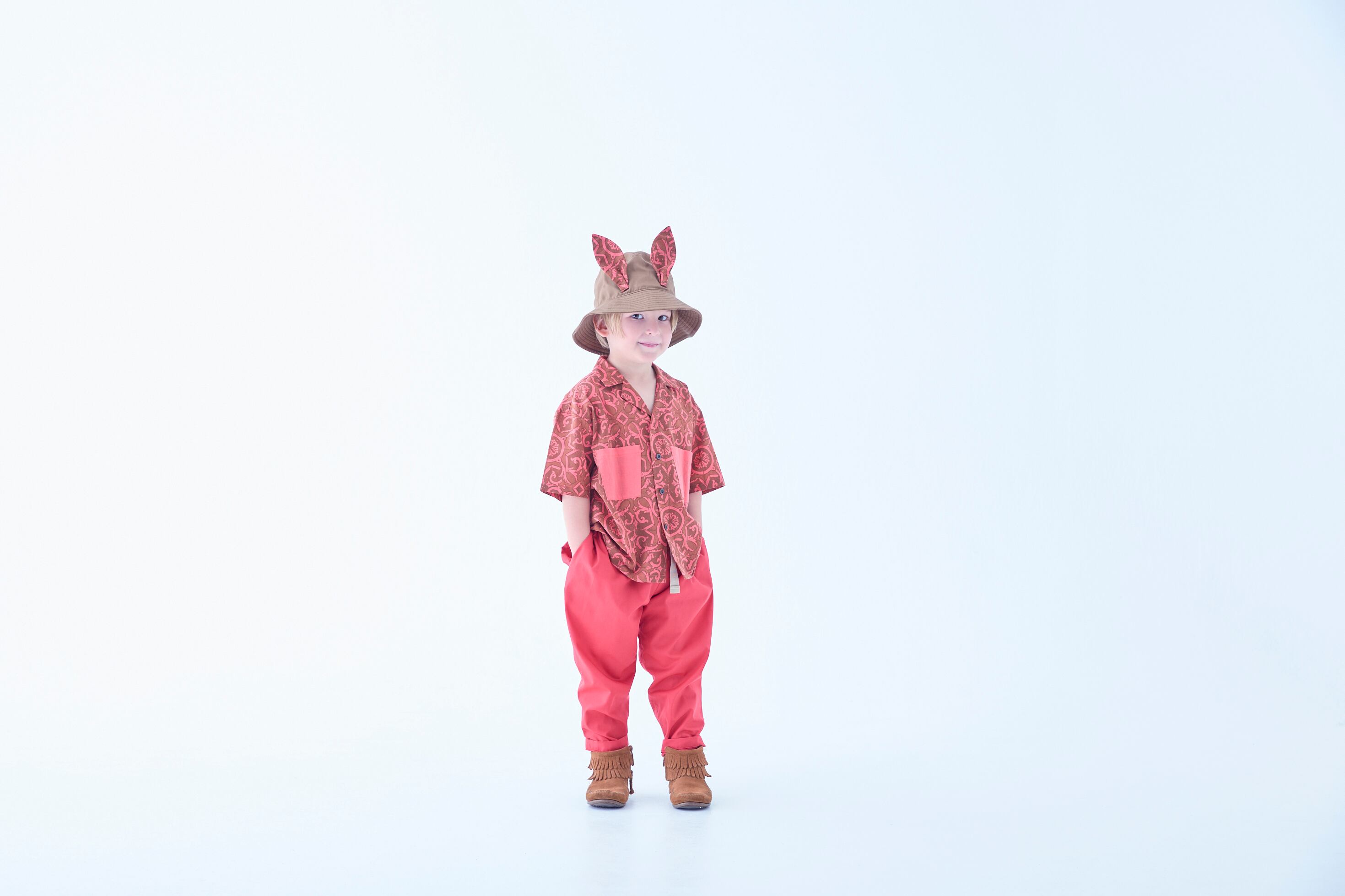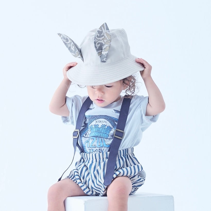 タイルの柄をプリントしたテキスタイル、ドラゴンと王国のイラストをプリントしたTシャツ、背中にたてがみのあるガーゼのトップス、⽿付きのビーストバケットハットなど異世界の住⺠を表現したアイテムに。今季初登場の⽔着にも、ポルトガルの古いタイルをプリントしたテキスタイルを使っています。