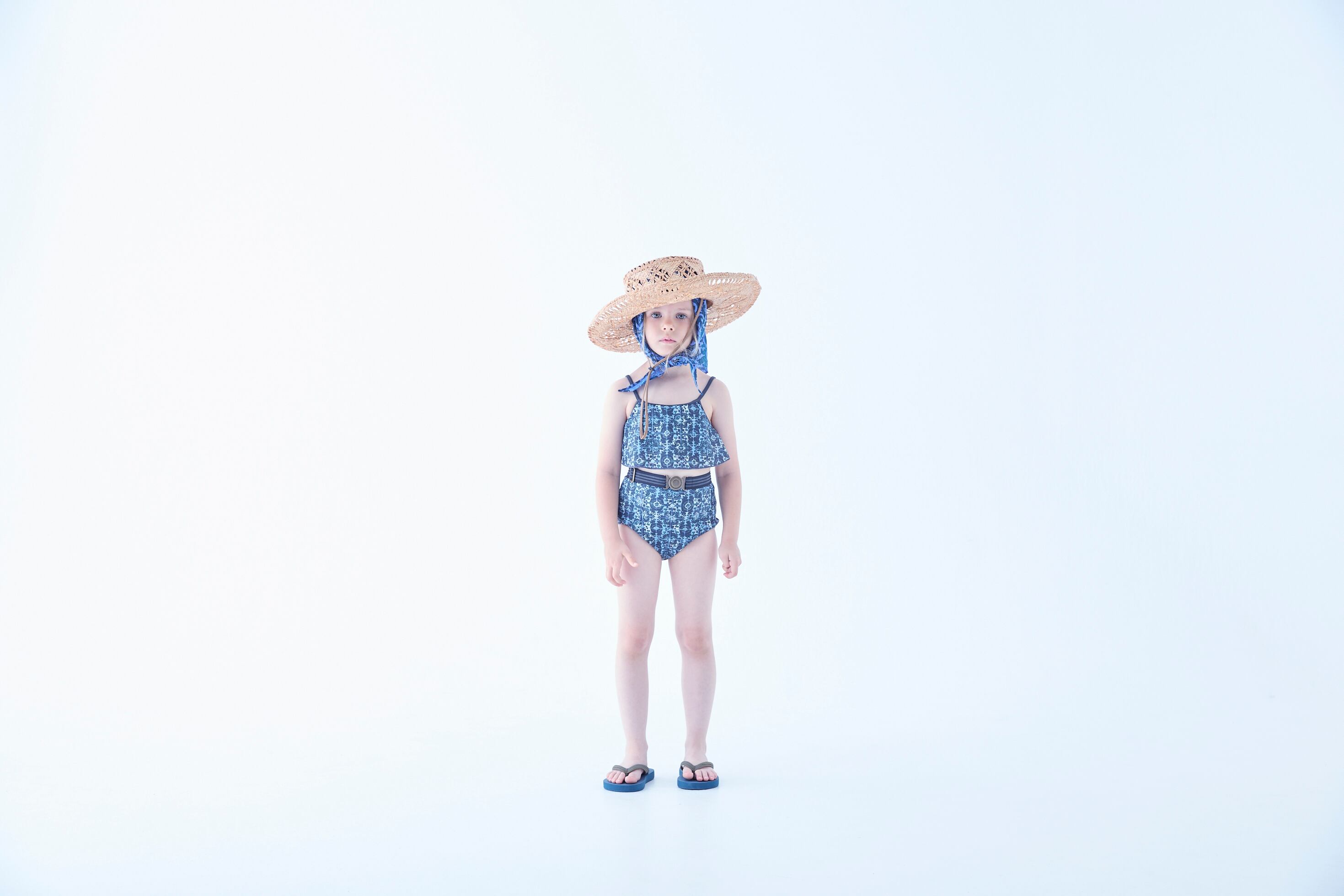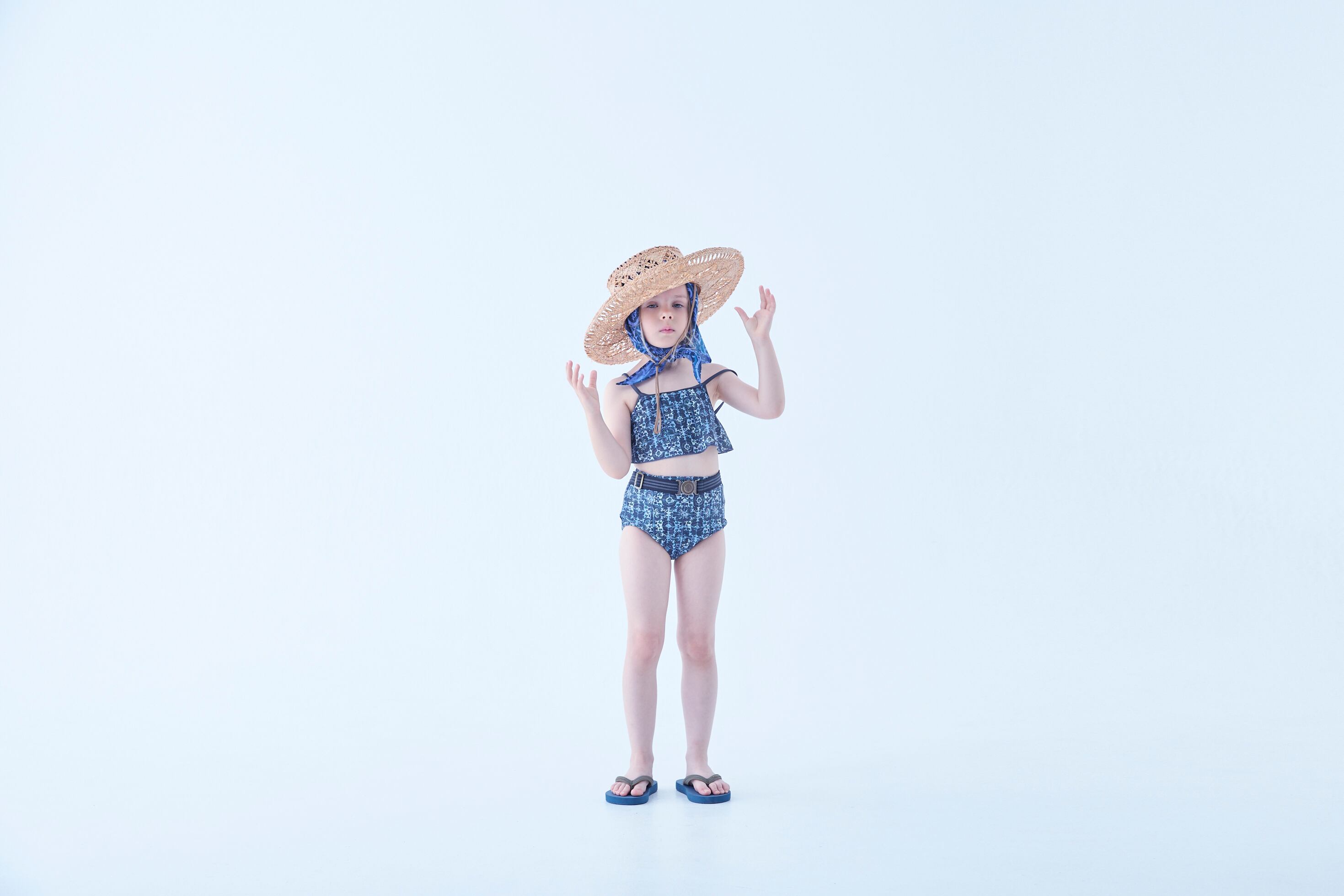 上下セパレートのガールズ⽔着は、肩紐を配⾊デザインしたクロップド丈のキャミソールのようなトップスと、股上の深いレトロな雰囲気のショーツがセットアップで安心して着用いただけます。