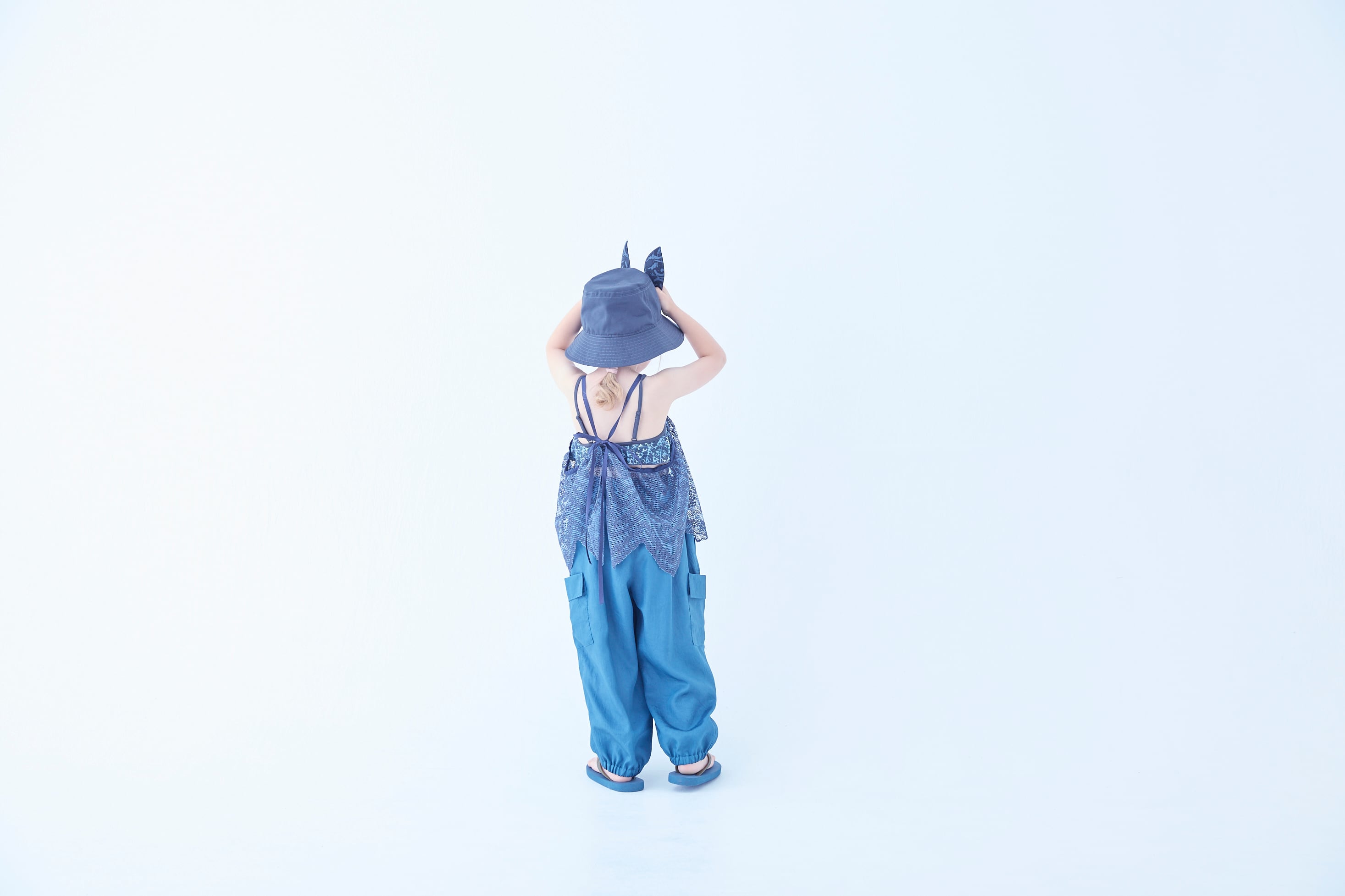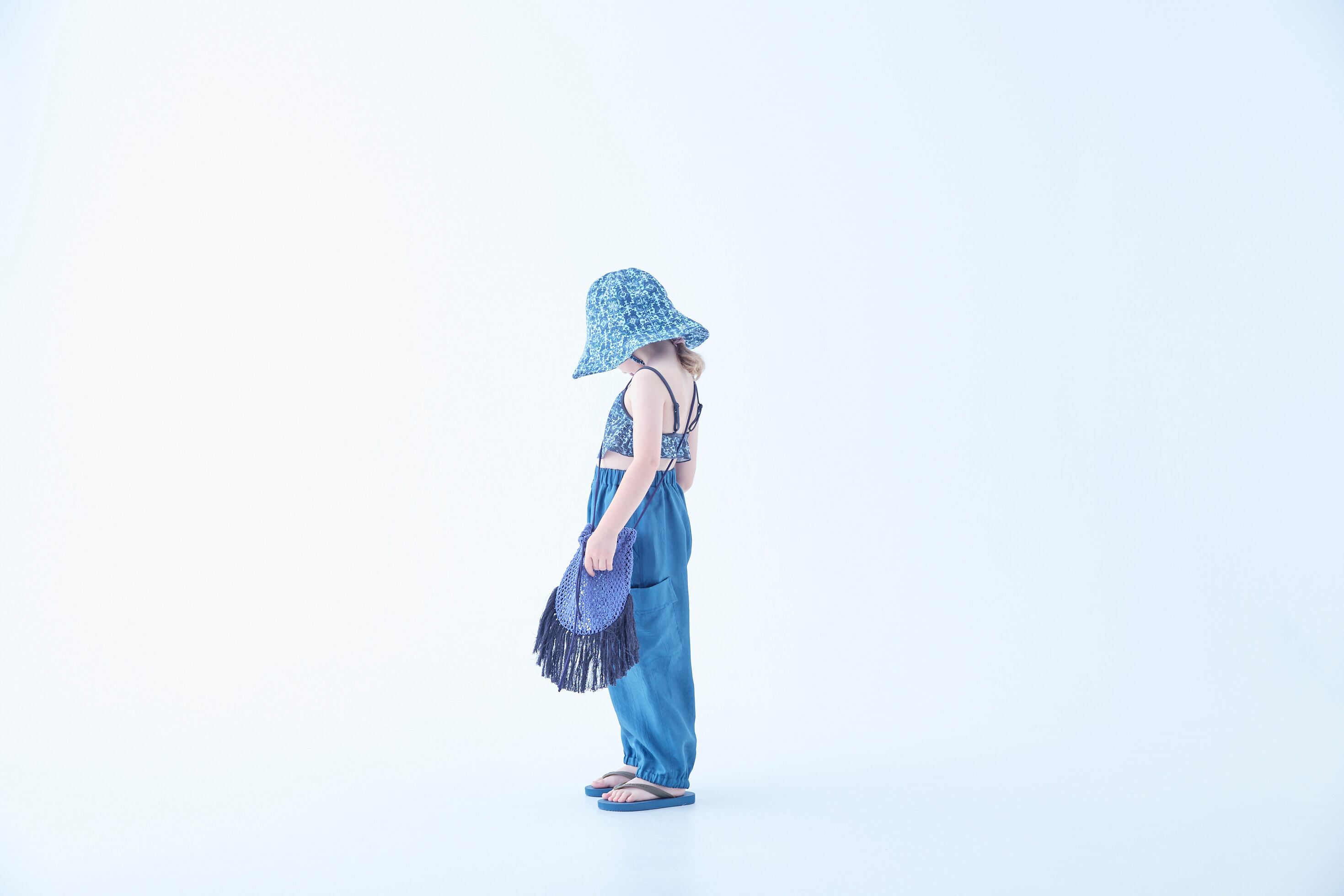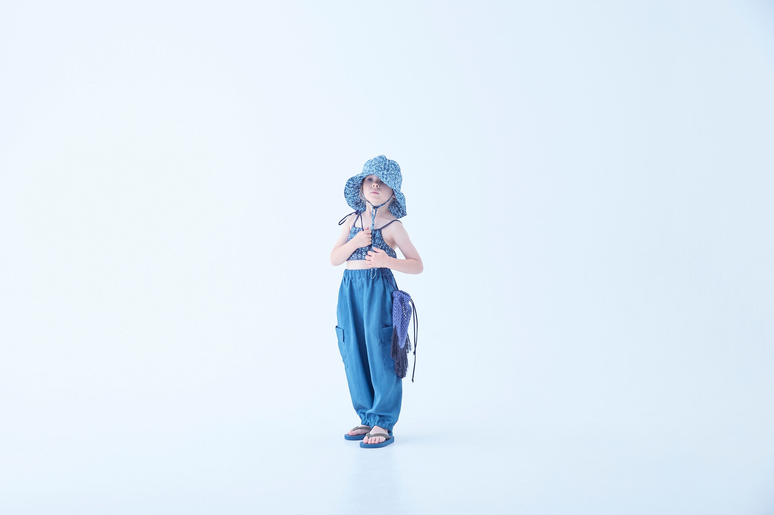 タイルの柄をプリントしたテキスタイル、ドラゴンと王国のイラストをプリントしたTシャツ、背中にたてがみのあるガーゼのトップス、⽿付きのビーストバケットハットなど異世界の住⺠を表現したアイテムに。今季初登場の⽔着にも、ポルトガルの古いタイルをプリントしたテキスタイルを使っています。