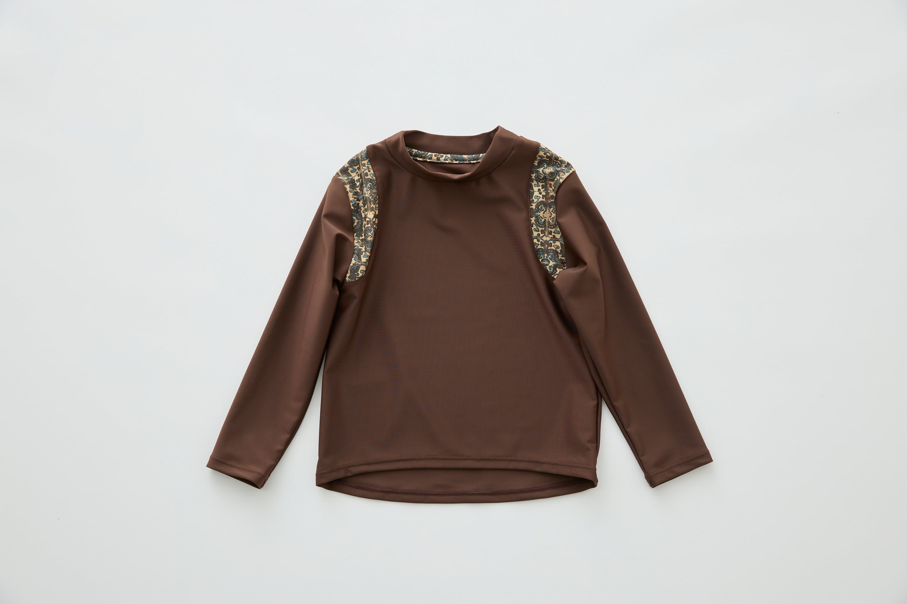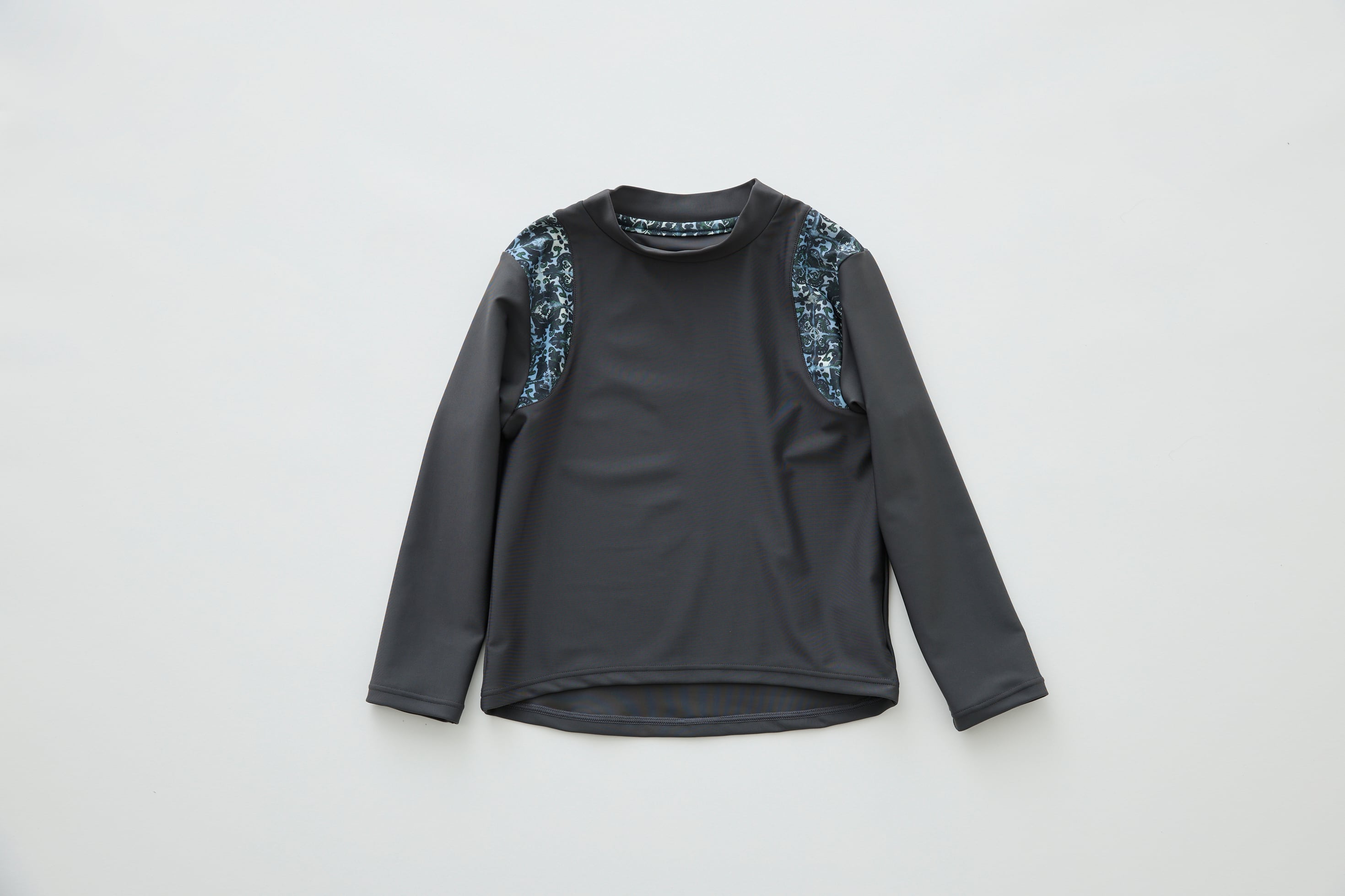 ラッシュガードはユニセックスで、男⼥問わず着⽤していただけます。スイムウェアと同柄のパイピング、ハイネックに⻑めの袖、肩幅が狭く⾒えるような配⾊デザインで、着⽤するとスリムに⾒える一着。