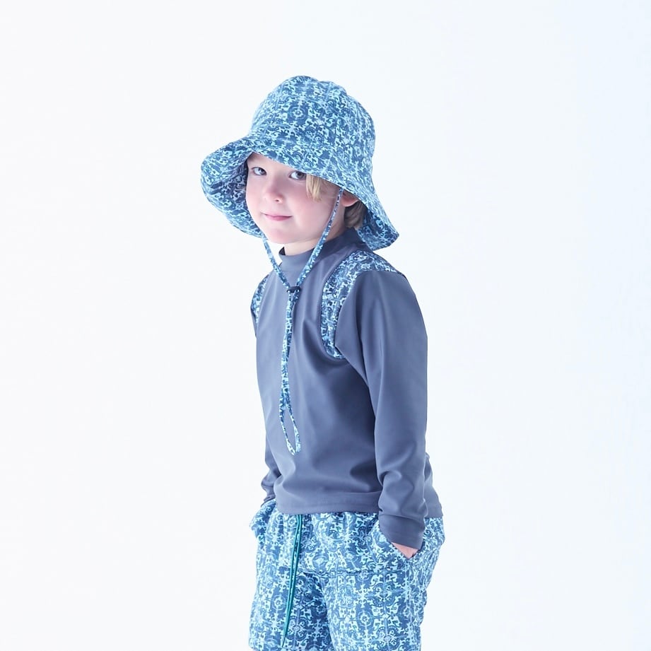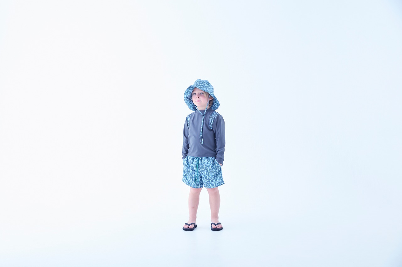 ポルトガルの旅で出会ったオールドタイルを図案に、ポリエステルの2WAY⽣地とサーフ⽣地にプリントしたeLfinFolk初の⽔着コレクション。