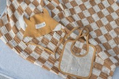お帽子と柄を合わせるのはもちろん、ビブだけでシンプルにコーディネートしても可愛い、おすすめアイテムです。
