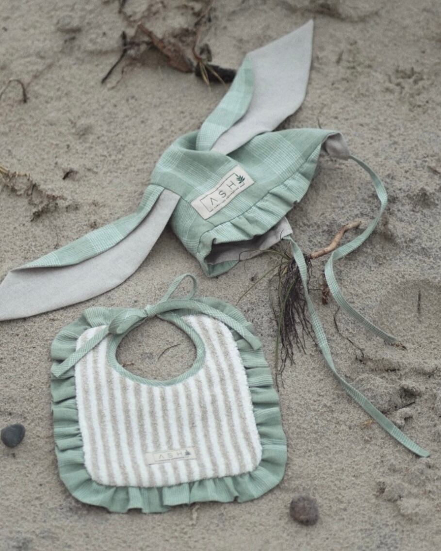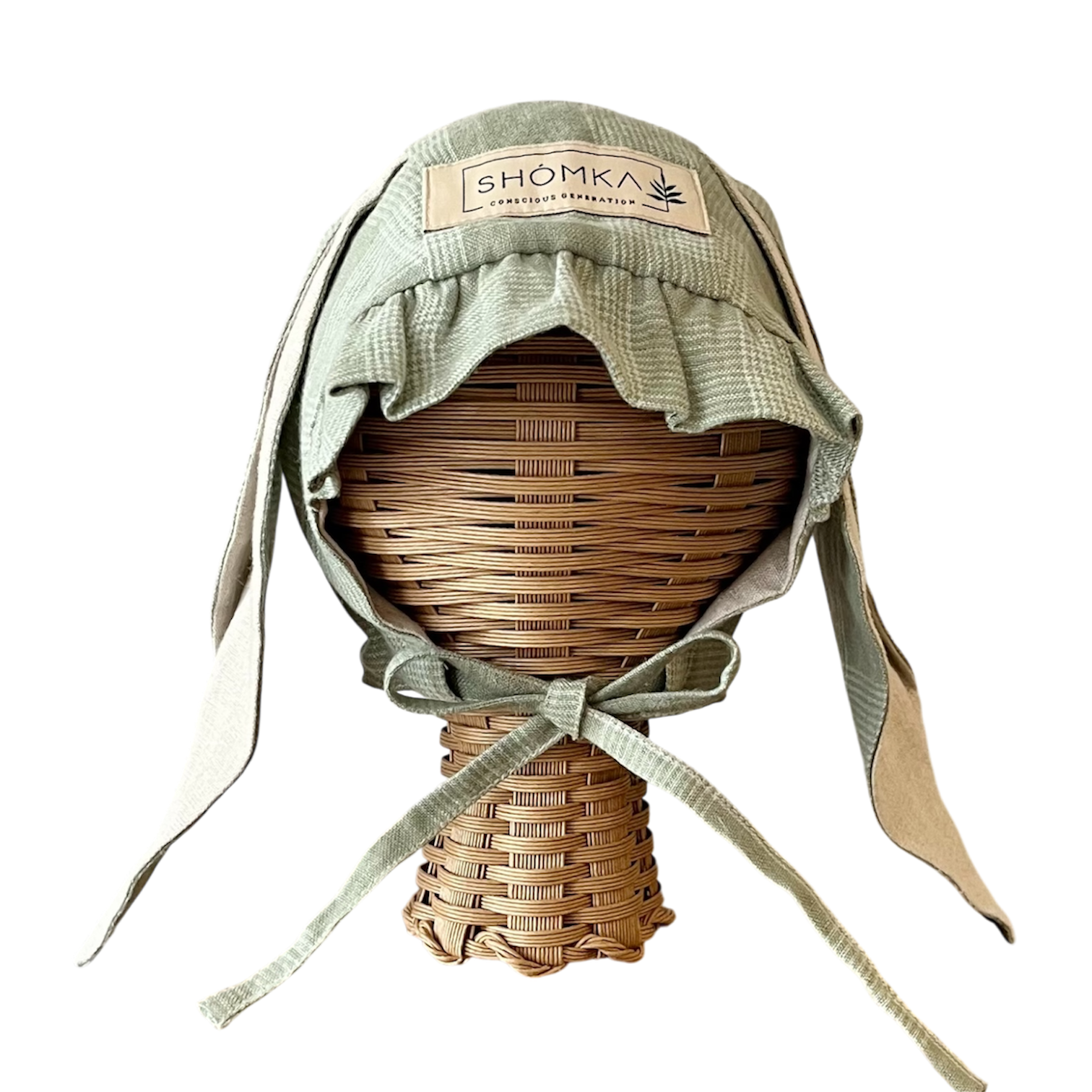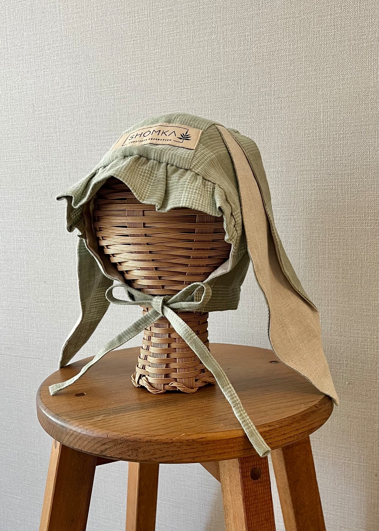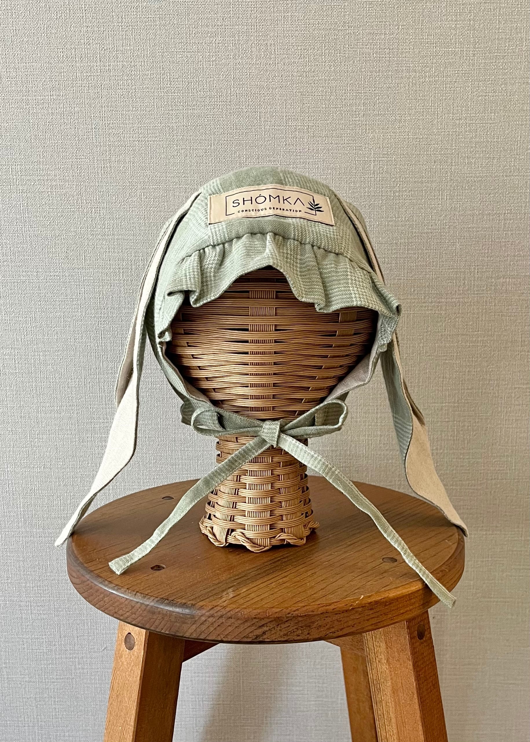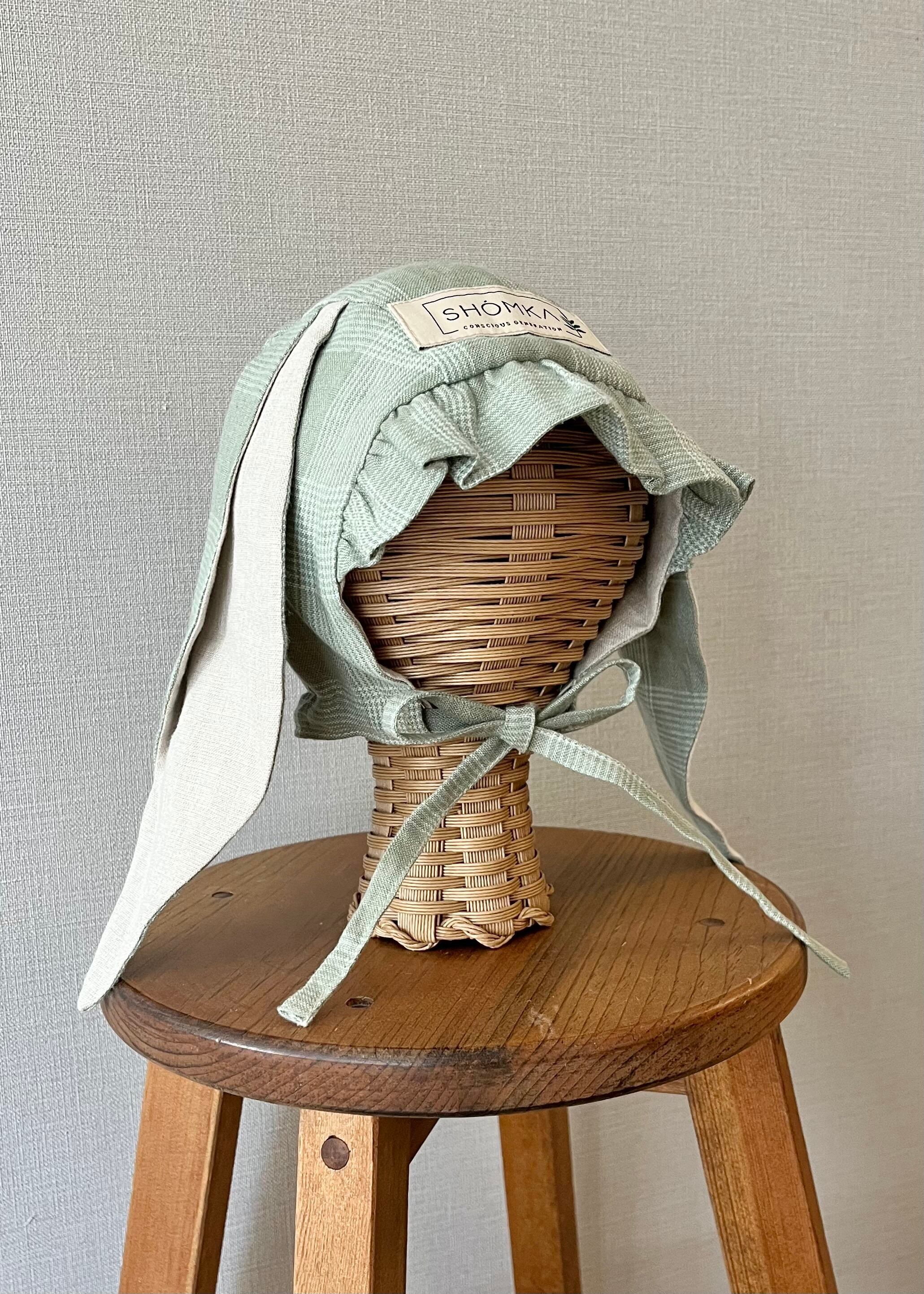爽やかなグリーンと模様がおしゃれなFieldsカラーにHare ( 野うさぎ ) の長いお耳がとっても可愛いボンネット。