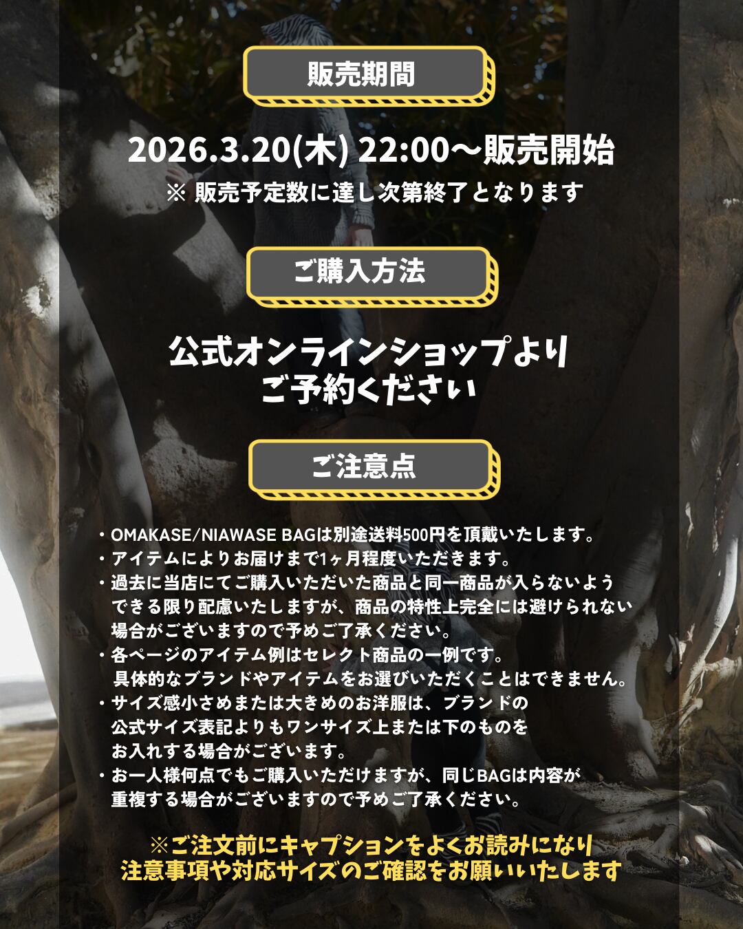 ※お一人様何点でもご購入いただけますが、お揃いの希望などは承れません。また同じBAGは内容が重複する場合がございますので予めご了承ください。